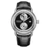 Číselník v uspořádání regulátoru odděluje zobrazení minut, hodin a sekund a nabízí jasnou strukturu čtení času. Centrální minutová ručka, oddělené čítače pro hodiny a sekundy a kontrast mezi černým saténovým pozadím a stříbřitými subčíselníky vytvářejí technicky vyvážený vzhled. Pouzdro o průměru 42 mm je vyrobeno z leštěné ušlechtilé oceli, jeho jemné linie a vypouklé safírové sklíčko navozují dojem, že se hodinky vznášejí nad zápěstím.