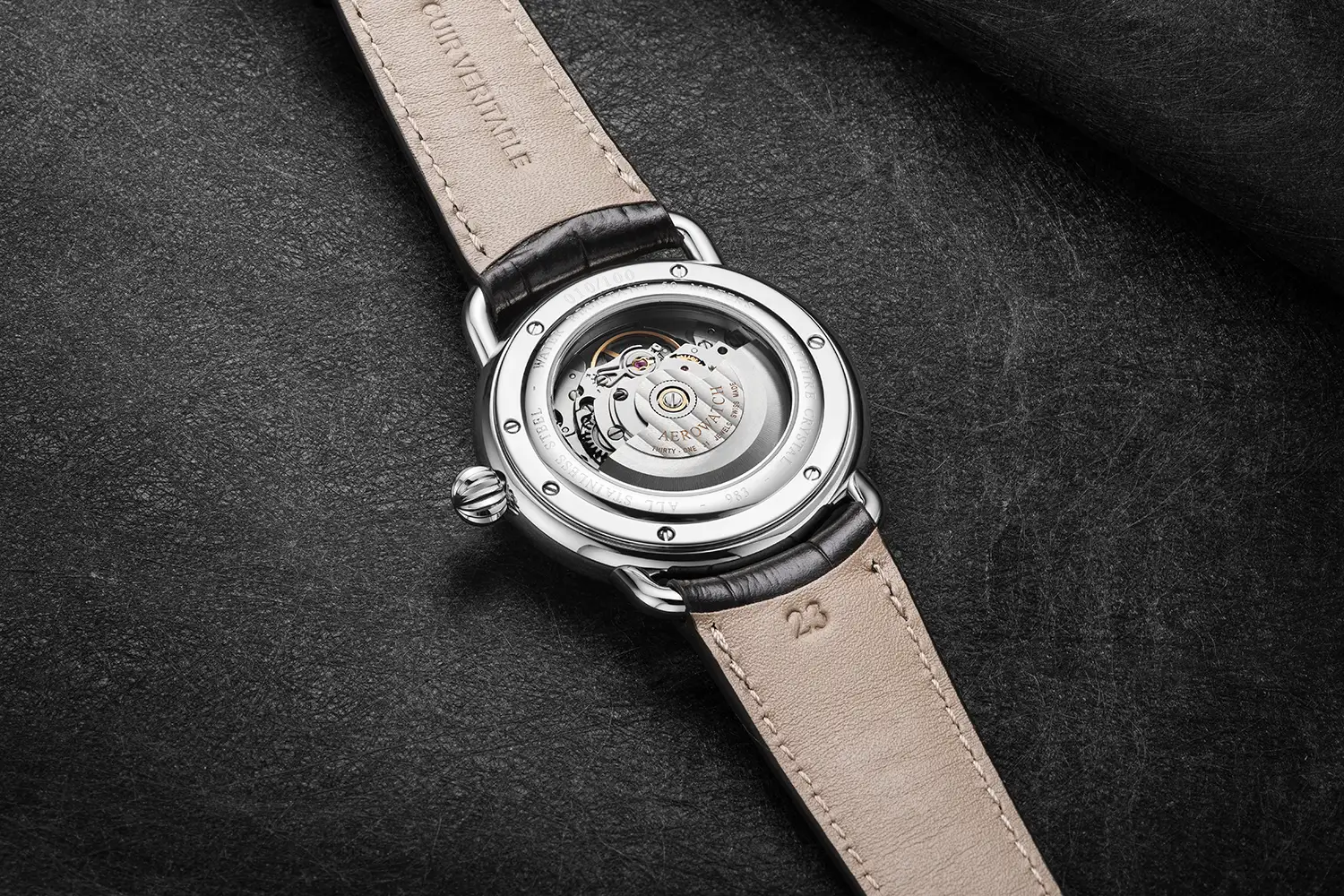 Model pohání automatický strojek Sellita SW266 s 31 ložiskovými kameny a 41hodinovou rezervou chodu. Přes prosklené zadní víčko je vidět dekorovaný rotor se zdobným gravírováním. Funkce zahrnují hodiny, minuty, sekundy a datumovku na třetí hodině. Celek doplňuje černý kožený řemínek s bezpečnostním motýlkovým zapínáním.