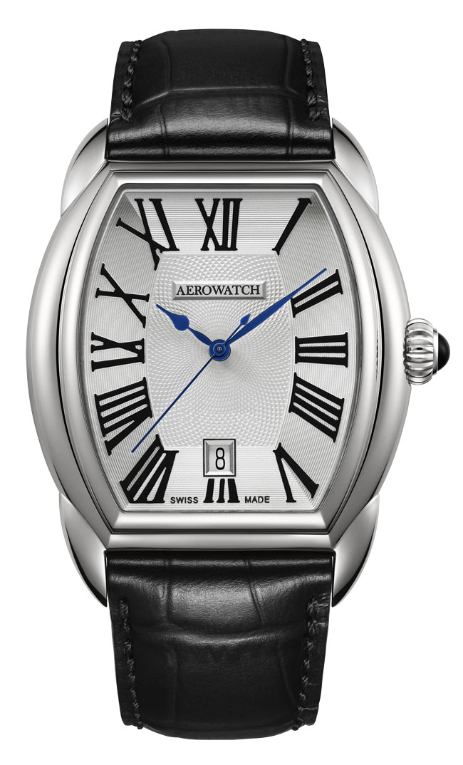 Číselník modelu Aerowatch 42959AA03 má světlou, stříbřitě lesklou barvu a je zdoben jemným gilošováním, které mu dodává hloubku a eleganci. Římské číslice v intenzivní černi vytvářejí výrazný vizuální akcent a zároveň zajišťují snadné odečítání času. Jejich klasický tvar skvěle ladí s moderní formou pouzdra. Modré ručky typu leaf, které jsou typickým znakem značky Aerowatch, dodávají celku vytříbený styl. Na pozici šesté hodiny se nachází nenápadně zakomponované datumové okénko, které nenarušuje harmonii kompozice a zároveň zvyšuje funkčnost hodinek.