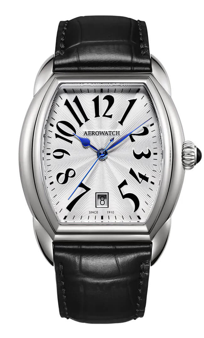 Číselník modelu Aerowatch 42959AA05NO se vyznačuje světlým, stříbrným pozadím s precizním gilošováním a výraznými černými arabskými číslicemi, které zajišťují skvělou čitelnost a vizuální vyváženost. Klasické modré ručky ve stylu leaf vnášejí barevný kontrast typický pro estetiku značky Aerowatch. Na pozici šesté hodiny se nachází nenápadně zakomponované datumové okénko, které neruší harmonii kompozice. Jsou to hodinky pro muže, který si váží detailu, estetiky a hodinářského řemesla v moderním pojetí.