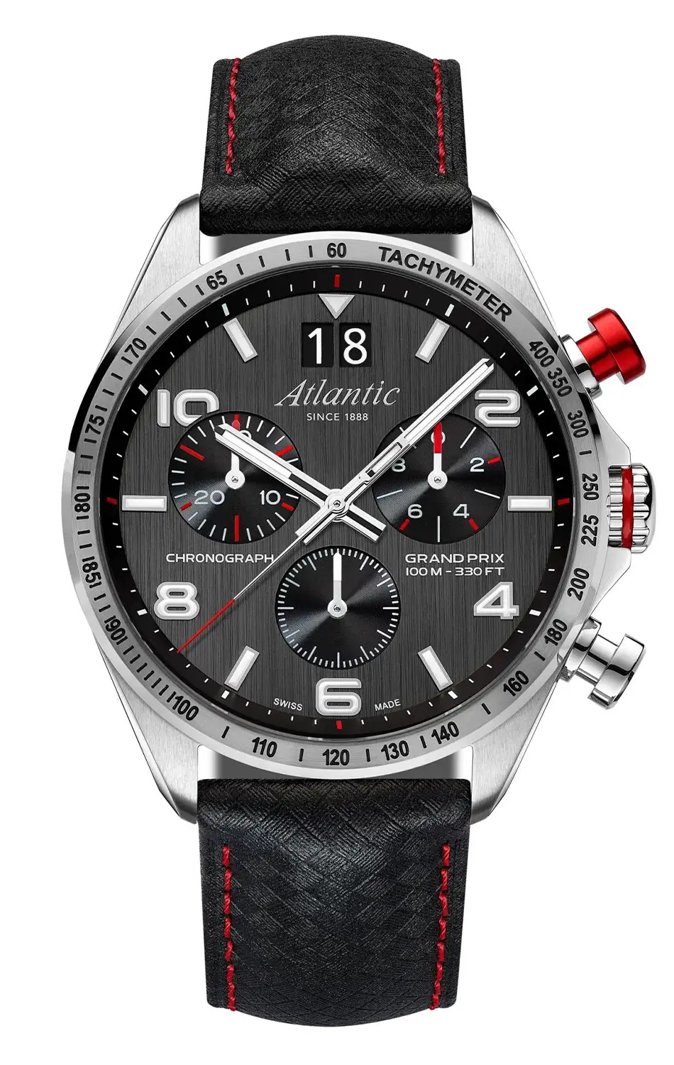 Atlantic Grand Prix Chrono je osazen koženým řemínkem s texturou inspirovanou karbonem a kontrastním červeným prošíváním, které podtrhuje jeho sportovní styl. Jedná se o model pro muže, kteří neuznávají kompromisy a hledají hodinky, jež se stejně dobře uplatní za volantem i při každodenním nošení.
