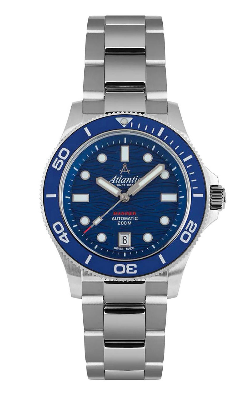 Modrý ciferník je zdoben charakteristickým vzorem připomínajícím vlny, což mu dodává dynamický, hluboký vzhled a zdůrazňuje mořský původ tohoto modelu. Silné indexy a masivní ručky vyplněné luminiscenční hmotou zajišťují čitelnost i ve tmě. Uvnitř pracuje švýcarský automatický strojek Sellita SW200-1 — kalibr známý svou spolehlivostí, přesností a odolností. Potápěčské automatické hodinky Atlantic 81776.41.59 jsou určeny pro muže, který potřebuje víc než jen stylový doplněk — jsou to skutečný nástroj času, připravený na hlubiny.