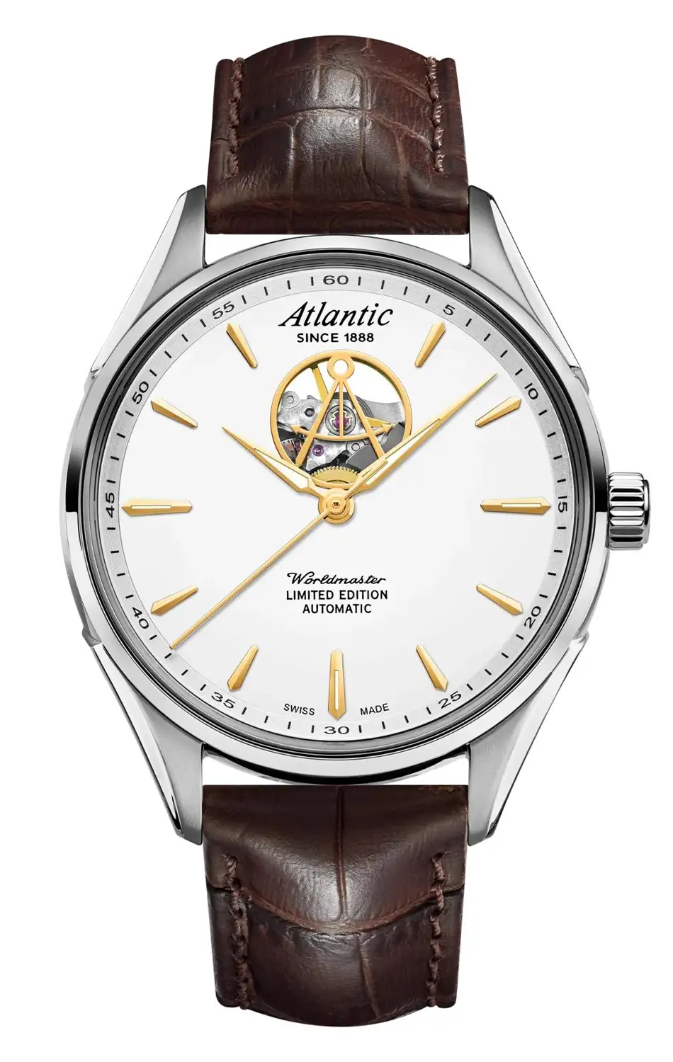 Limitované pánské hodinky Atlantic Worldmaster Open Heart Limited Edition 52780.41.21G jsou večerním doplňkem v retro barevném stylu, který doplňuje vlajkovou kolekci nadčasových modelů Worldmaster. Právě on svými konci dotýká protilehlých pólů dekorace povrch pod dvanáctou hodinou. Ve skutečnosti tvoří okno, skrz které je vidět kroková práce kotvy, oscilujícího setrvačníku a krokového kola, do nichž je zakomponováno logo. „Open heart” je doslovné označení pro tyto prvky, jež tvoří jakési „srdce” automatického strojku. Tento tradiční model s neopakovatelným, specificky atlantickým designem je dostupný pouze w počtu 888 číslovaných kusů.