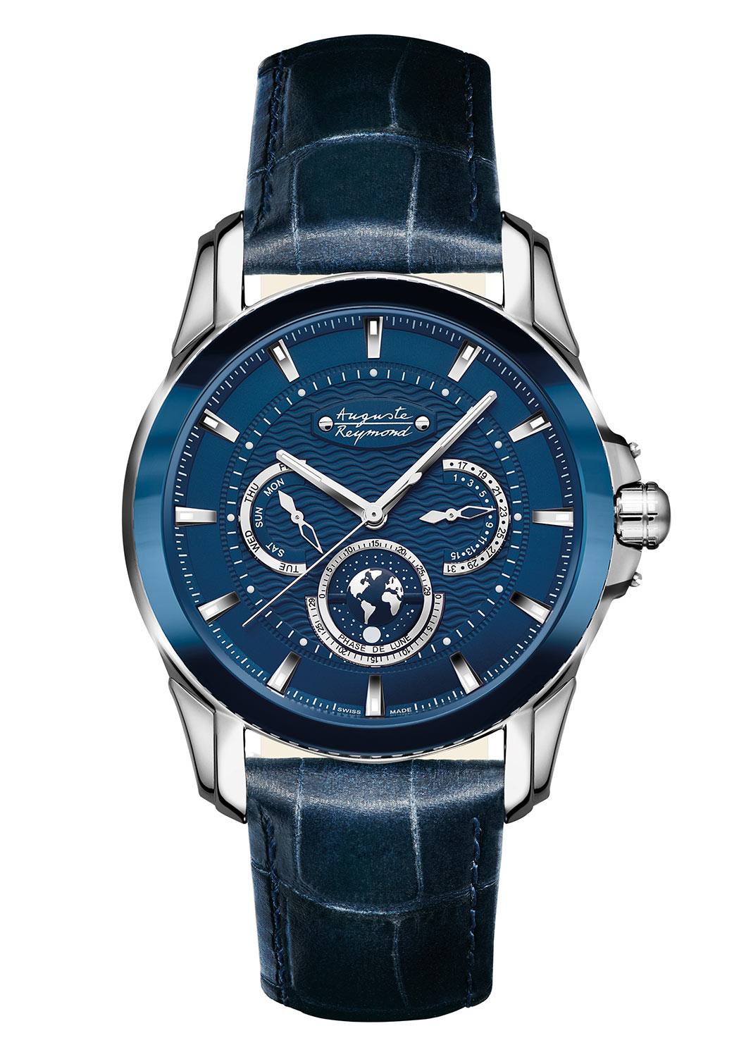 Modrý ciferník Auguste Reymond Tramelan Magellan Orbital Moon je zdoben rafinovanými gilošovými vlnami, které mu dodávají nenápadnou eleganci a sofistikovanost. V pouzdře tohoto unikátního modelu je umístěn přesný švýcarský strojek s podmanivou komplikací orbitální fáze Měsíce, s rotujícím diskem zobrazujícím fascinující cestu Měsíce kolem Země, zachycující ducha neomezeného průzkumu vesmíru. Řada MAGELLAN klade důraz na silný, a přesto mužný design, je dokonalým společníkem na neobyčejné životní cesty. Na oslavu 125. výročí značky bylo na číselníku zachováno původní logo AUGUSTE REYMOND, které toto zvláštní výročí zdůrazňuje. Celek je završen antireflexním safírovým sklíčkem, které je odolné proti poškrábání, zajišťuje odolnost a nadčasovou krásu hodinek.