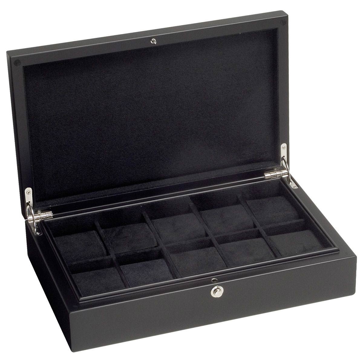Elegantní, vysoce kvalitní krabička na 10 hodinek v černém matném dřevě. Krabička je vyrobena s důrazem na nejmenší detaily, uvnitř vystlaná přátelským sametem. Moderní a dokonalý způsob uložení vašich oblíbených hodinek, ideální jako dárek. Elegantní forma v precizním provedení.