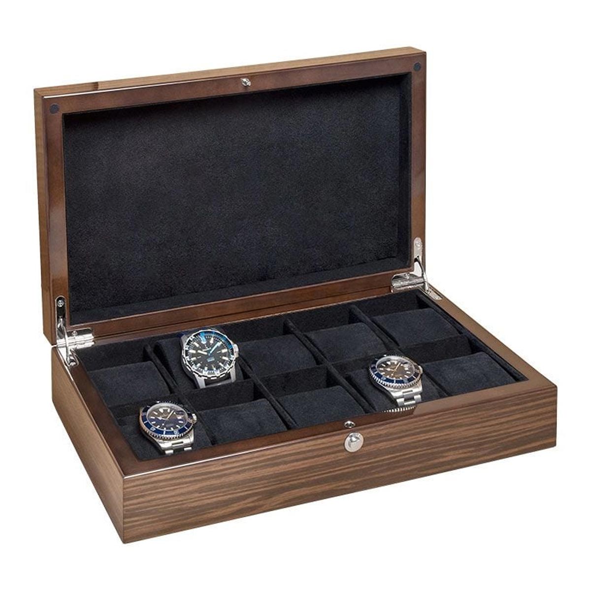 Elegantní, kvalitní krabička na 10 hodinek. Vyrobeno z hnědého dřeva Macassar, leštěno do vysokého lesku. Krabice je vyrobena s důrazem na nejmenší detaily. Vnitřek je podšitý měkkým a na dotek příjemným materiálem. Moderní a dokonalý způsob uložení vašich oblíbených hodinek, ideální jako dárek. Elegantní forma v precizním provedení.