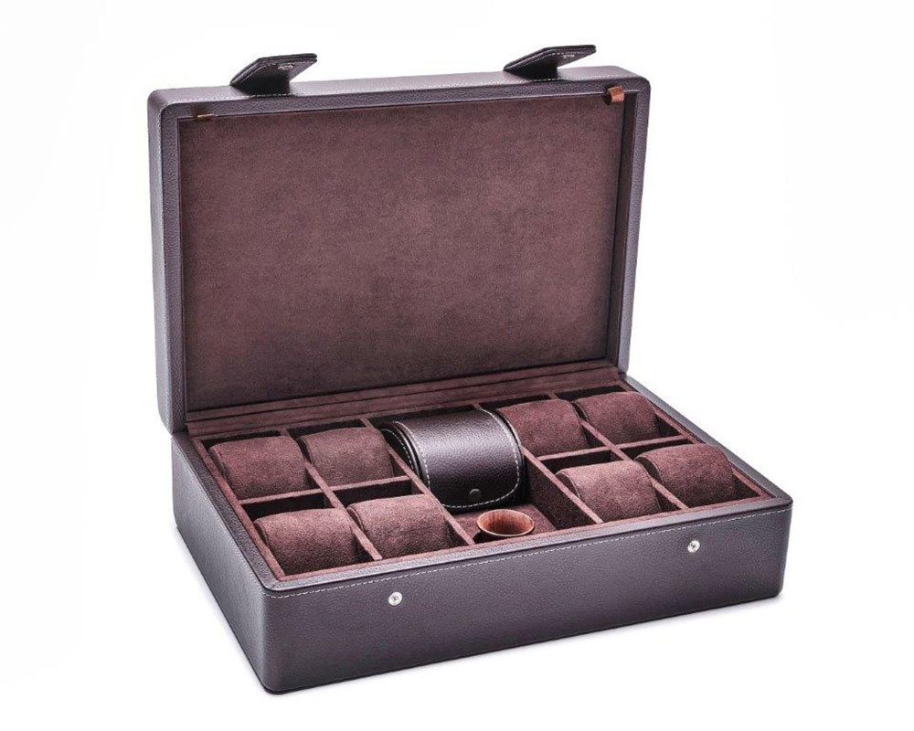 Vysoce kvalitní sběratelský box až na 9 hodinek. Leanschi WBO9-CHOC obsahuje oválné cestovní pouzdro na 1 hodinky, lupu (faktor zvětšení 5,0) a nástroj na výměnu řemínku hodinek. Ve víku je integrována další přihrádka, kam můžete uložit řemínky nebo náramek na hodinky. Ekologický MDF rám potažený čokoládově hnědou syntetickou kůží. Logo značky je vyraženo uprostřed vnější strany víka. Díky lupě můžete obdivovat mechanismy těch nejlepších hodinek jako profesionálové a pomocí nástroje vyměnit řemínky hodinek podle svého uvážení.
