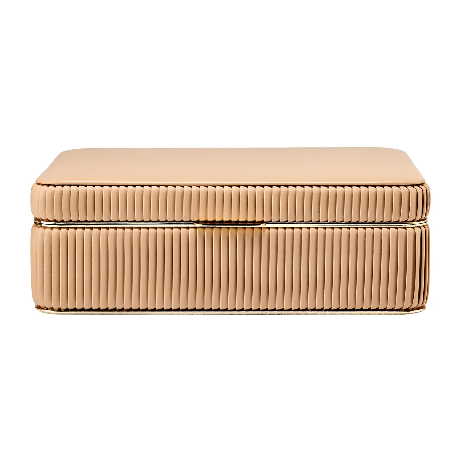 WOLF Bella 781029 je středně velký box na šperky, který spojuje eleganci s praktičností. Klasický tvar, dokonale skládané boky a hladké víko z béžové veganské kůže tvoří harmonický celek. Celkový luxusní dojem podtrhují zlaté detaily a rámeček interiéru.