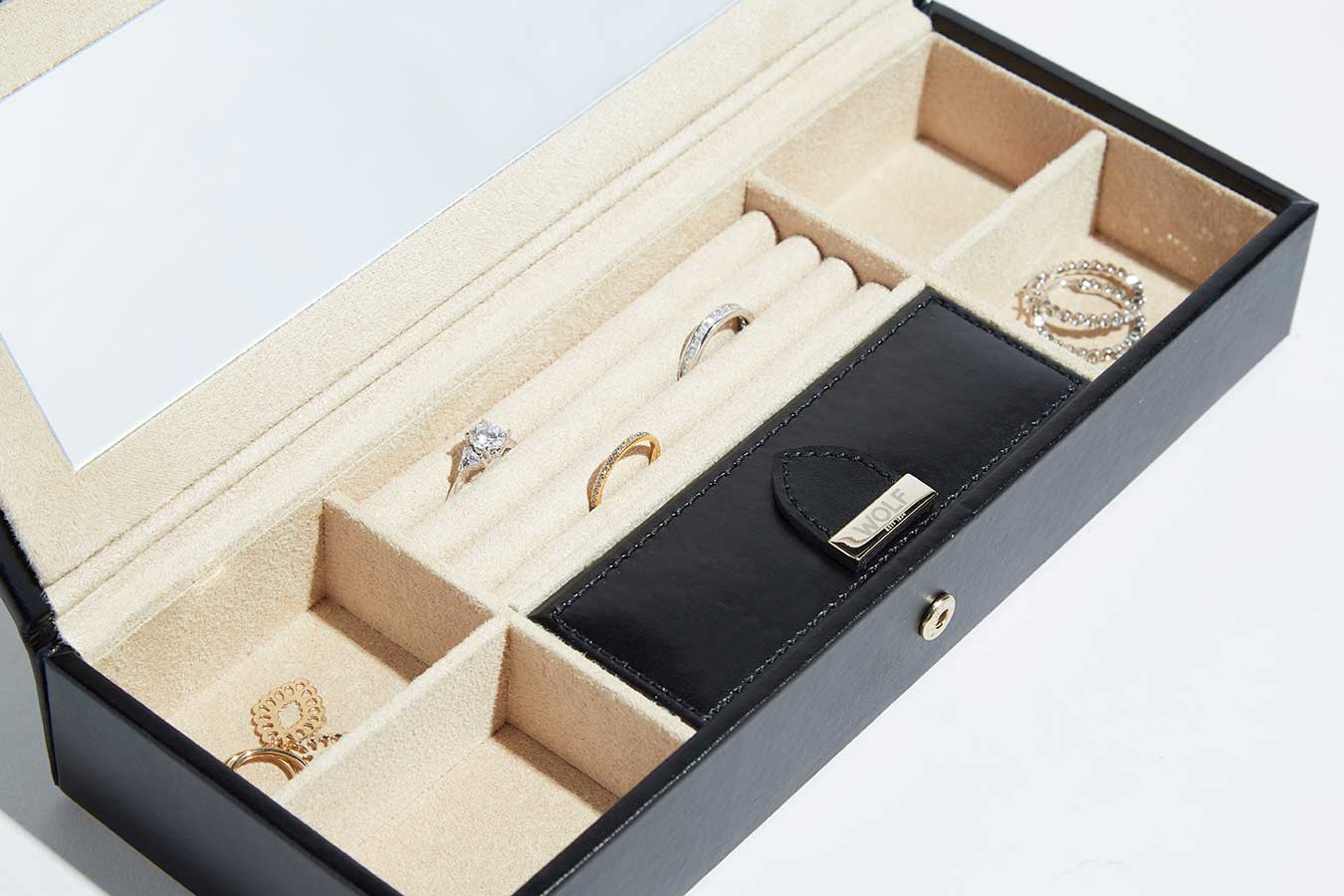 Vydejte se na cestu do exotického a opojného místa, kde se kůže a zlacené cvočky spojují a vytvářejí orientální vzory. Krásná šperkovnice WOLF Marrakesh 308402 v černé barvě s 5 přihrádkami a 3 ruličkami na prsteny. Díky tvaru a rozměrům 27,5 cm x 11,4 cm x 5 cm (délka, šířka, výška) se tento box perfektně hodí do většiny trezorů nebo může být skvělým společníkem na cesty. Vnitřek je lemován speciálním materiálem WOLF LusterLoc™ , který pohlcuje plyny, které způsobují zašednutí a ztmavnutí šperků. Zajišťuje tak dokonalý vzhled šperků po dobu minimálně 35 let. Uvnitř krabice je také elegantní zrcátko na klopě.