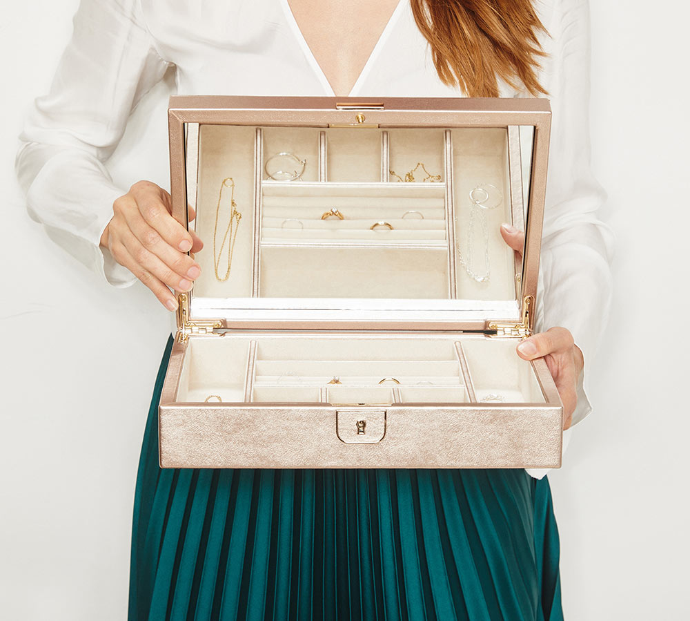 Okouzlující a sofistikovaná šperkovnice Wolf Palermo 213216 čerpá inspiraci ze stejnojmenného italského města. Toto luxusní pouzdro na šperky, zabalené v krásné kůži z růžového zlata, poskytuje bezpečné místo pro vaše cennosti. Vnitřek je lemován speciálním materiálem WOLF LusterLoc™ , který pohlcuje plyny, které způsobují zašednutí a ztmavnutí šperků. Zajišťuje tak dokonalý vzhled šperků po dobu minimálně 35 let. Uvnitř krabice je také elegantní zrcátko na klopě.