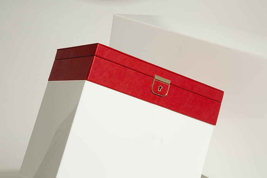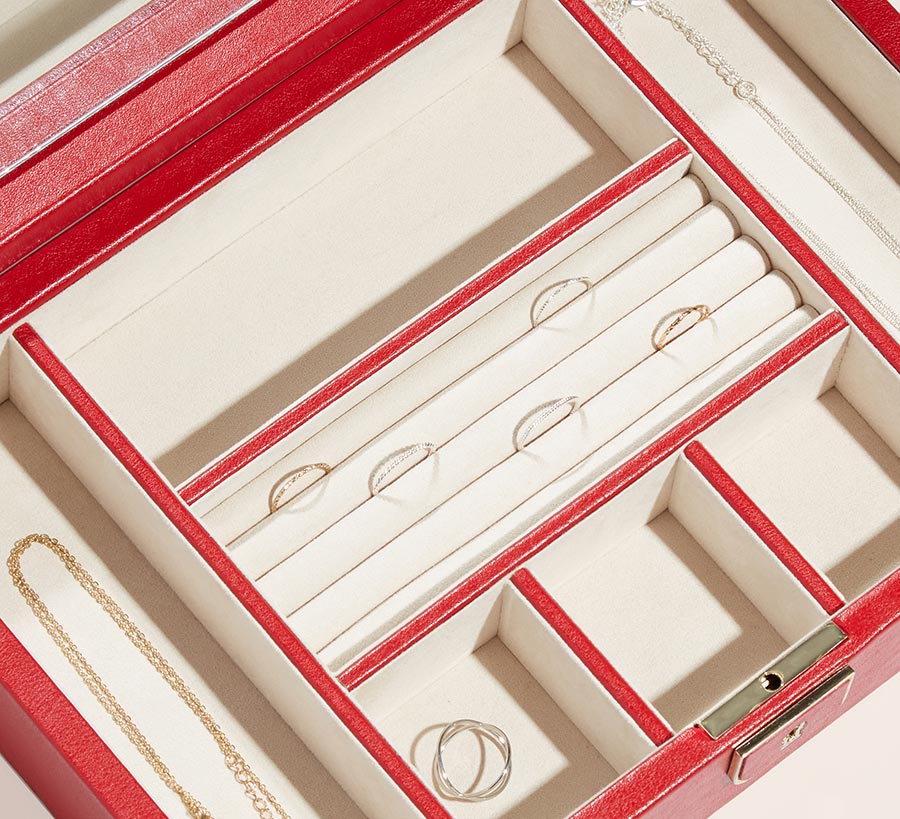 Okouzlující a sofistikovaná šperkovnice Wolf Palermo 213272 čerpá inspiraci ze stejnojmenného italského města. Toto luxusní pouzdro na šperky, zabalené v krásné červené kůži, poskytuje bezpečné místo pro vaše cennosti. Vnitřek je lemován speciálním materiálem WOLF LusterLoc™ , který pohlcuje plyny, které způsobují zašednutí a ztmavnutí šperků. Zajišťuje tak dokonalý vzhled šperků po dobu minimálně 35 let. Uvnitř krabice je také elegantní zrcátko na klopě.