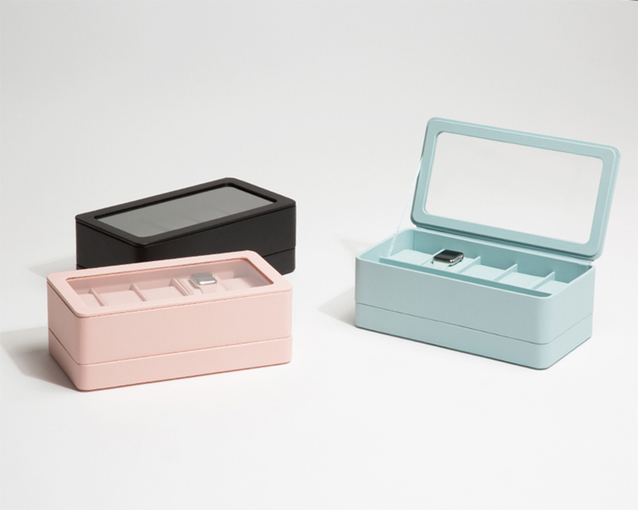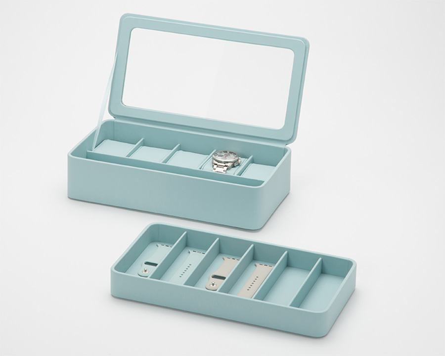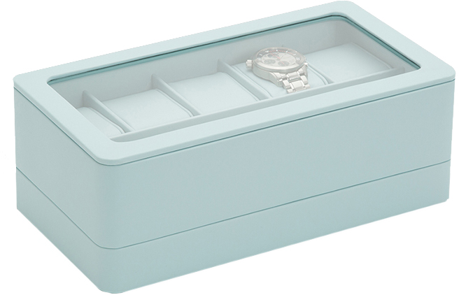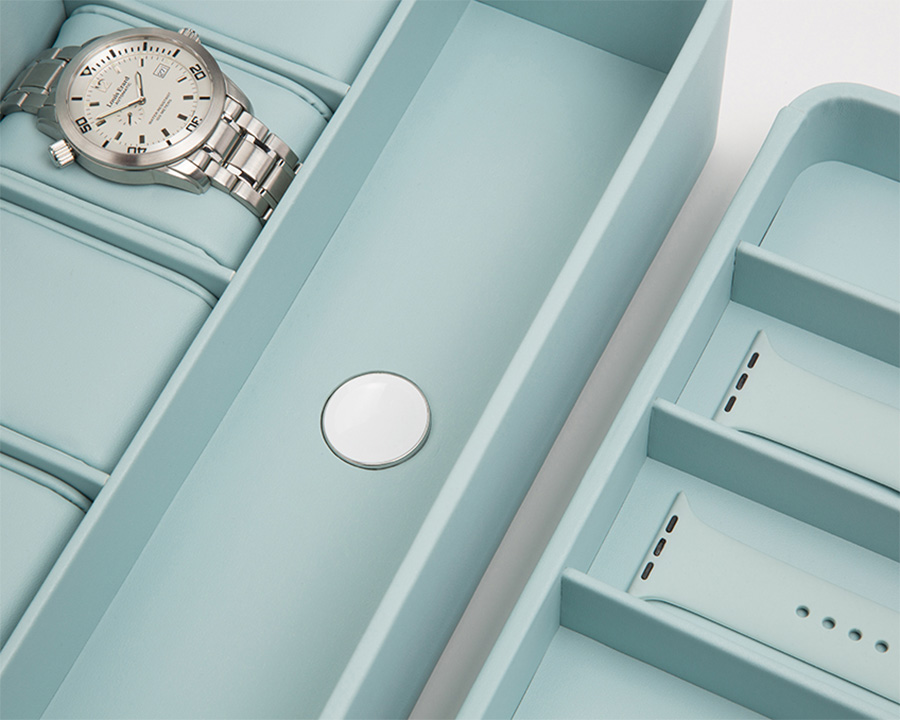 Exkluzivní mintově zelená krabička na 6 Apple Watch nebo tradiční hodinky. Jedinečný design a kvalitní zpracování, které dodají závan čerstvého vzduchu každému interiéru. Má 5 přihrádek na tradiční hodinky a také místo s vestavěnou bezdrátovou nabíječkou pro Apple Watch. Ze spodní části boxu je vyjímatelná zásuvka se 6 sloty na lišty. Shora je schránka uzavřena prosklenou klopou.