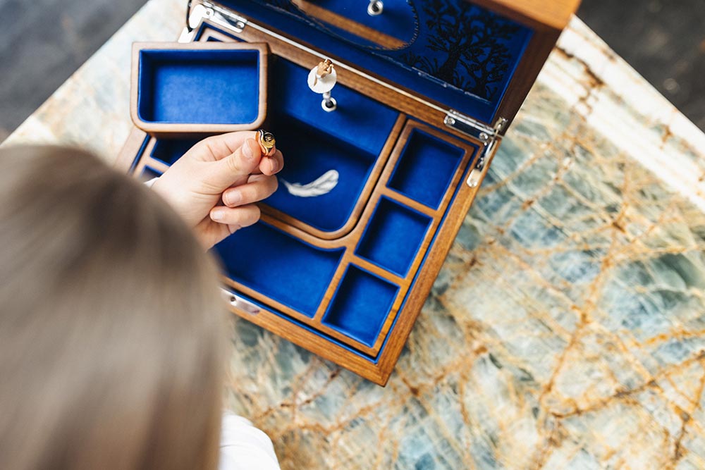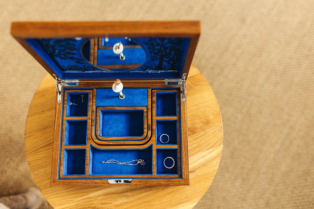 Interiér, inspirovaný designem velkého divadla, má jednu velkou a sedm malých samostatných přihrádek na šperky, všechny ručně vyrobené ze dřeva a lemované ultrasuedem v barvě noční oblohy. Technologie ochrany LusterLoc™ zabraňuje zmatnění šperku, což je přirozený proces po kontaktu se vzduchem. LusterLoc™ tento proces neutralizuje a udrží vaše šperky jako nové až 35 let. Zrcadlo se zvlněným okrajem je obklopeno vyšívaným vzorem Labutího jezera se stromy a siluetou jezera podle návrhu Fiony Howard. Šperkovnice obsahuje dvě vyměnitelné ručně vyřezávané baleríny s různými odstíny pleti.