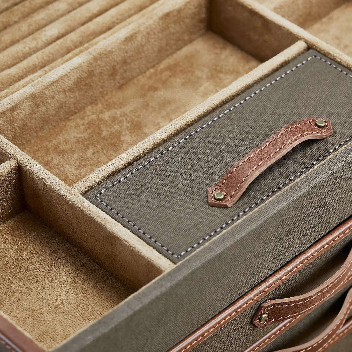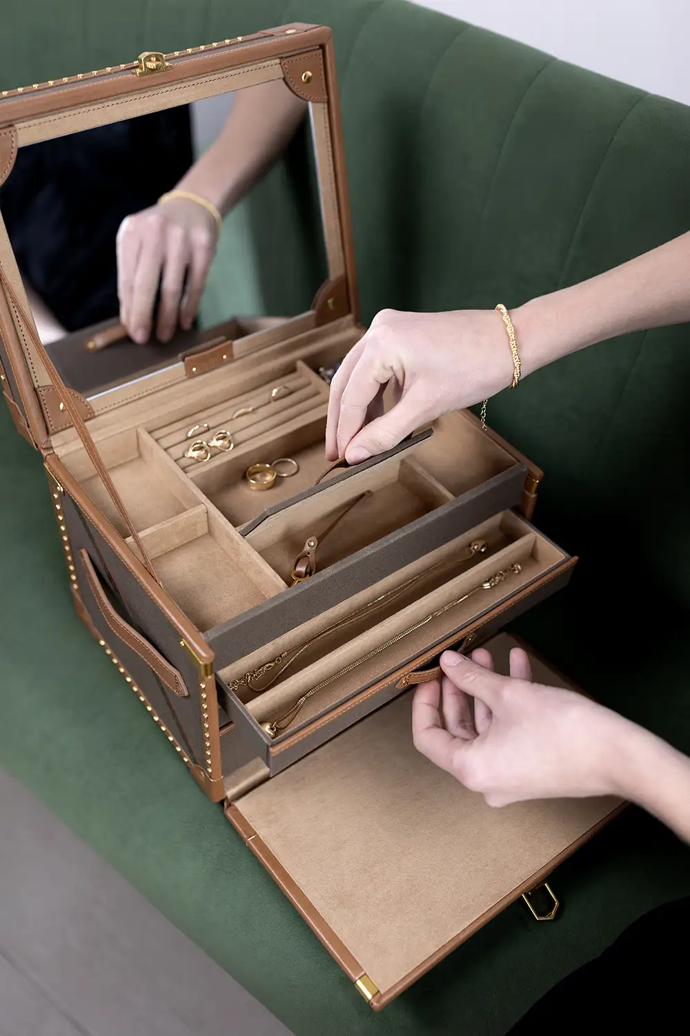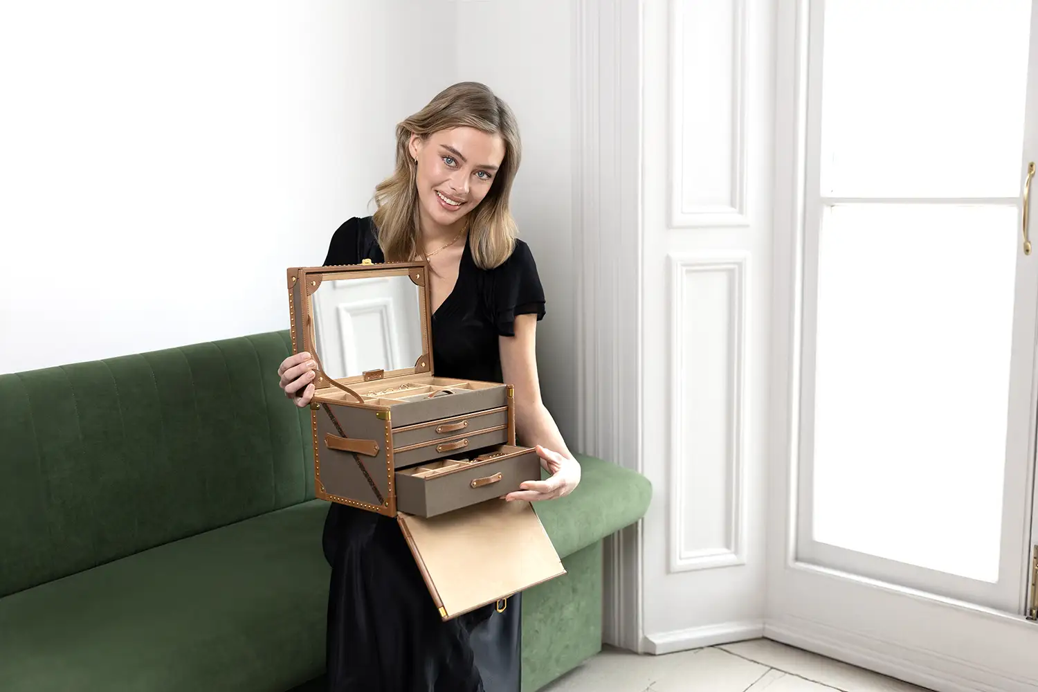 Vnitřek je vyložen jemným materiálem Ultrasuede s technologií LusterLoc™, která účinně chrání šperky před zmatněním až po dobu 35 let. Horní sekce obsahuje prostor na prsteny a pět otevřených přihrádek, stejně jako uzavíratelný tác ideální pro uspořádání drobných doplňků. Ve víku se nachází velké zrcadlo a tři další zásuvky nabízejí prostor pro větší kusy šperků – včetně vestavěného cestovního pouzdra s oddělenou přihrádkou.