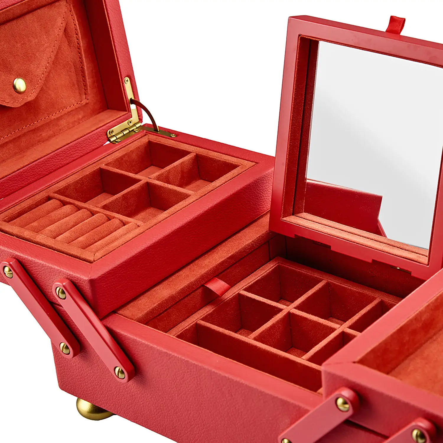 Rafinované detaily, jako je skládací zrcátko, tajné přihrádky či vyjímatelná přihrádka, činí z této krabičky ideální místo pro uložení prstenů, náhrdelníků, náušnic a drobných doplňků. Vnitřek je vyložen inovativním materiálem LusterLoc™, který chrání šperky před zmatněním až po dobu 35 let. Nejde jen o funkční šperkovnici – je to promyšlený prvek interiéru, který dodá každému prostoru osobitý charakter.