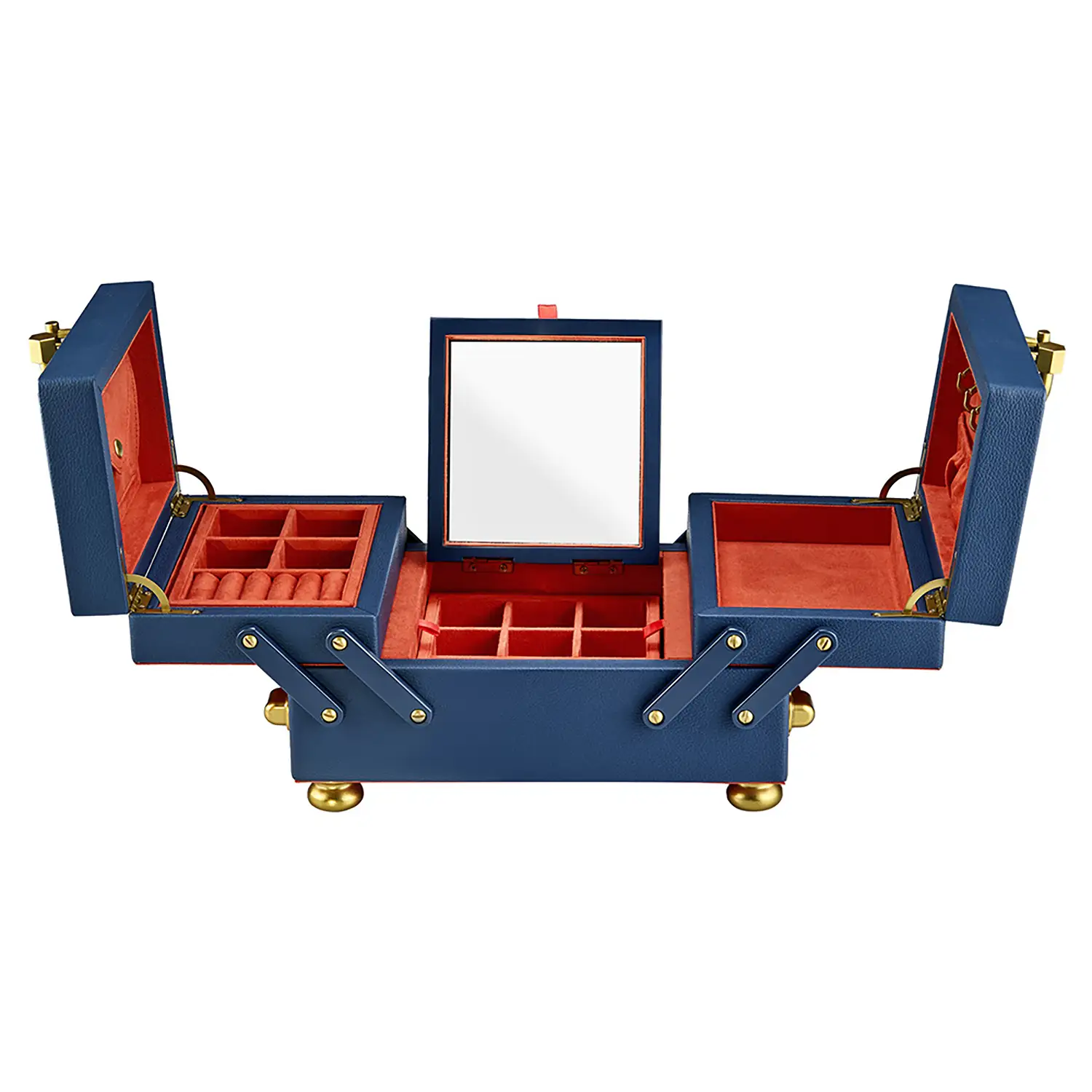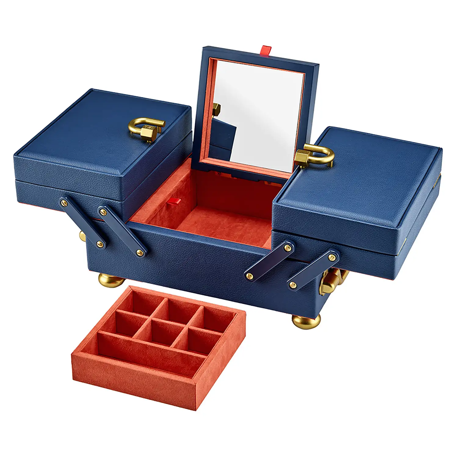 - Uspořádání: 2 boční držáky na prsteny, 1 vyjímatelná přihrádka se 4 válečky na prsteny a 4 oddíly, 3 hlavní úložné prostory, 2 skryté schránky, 4 háčky na náhrdelníky a kapsa, 1 obálka na uložení, sklopné zrcátko