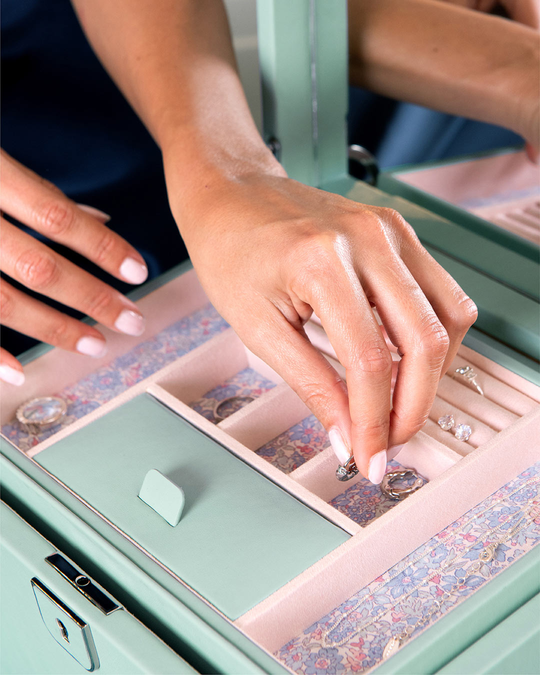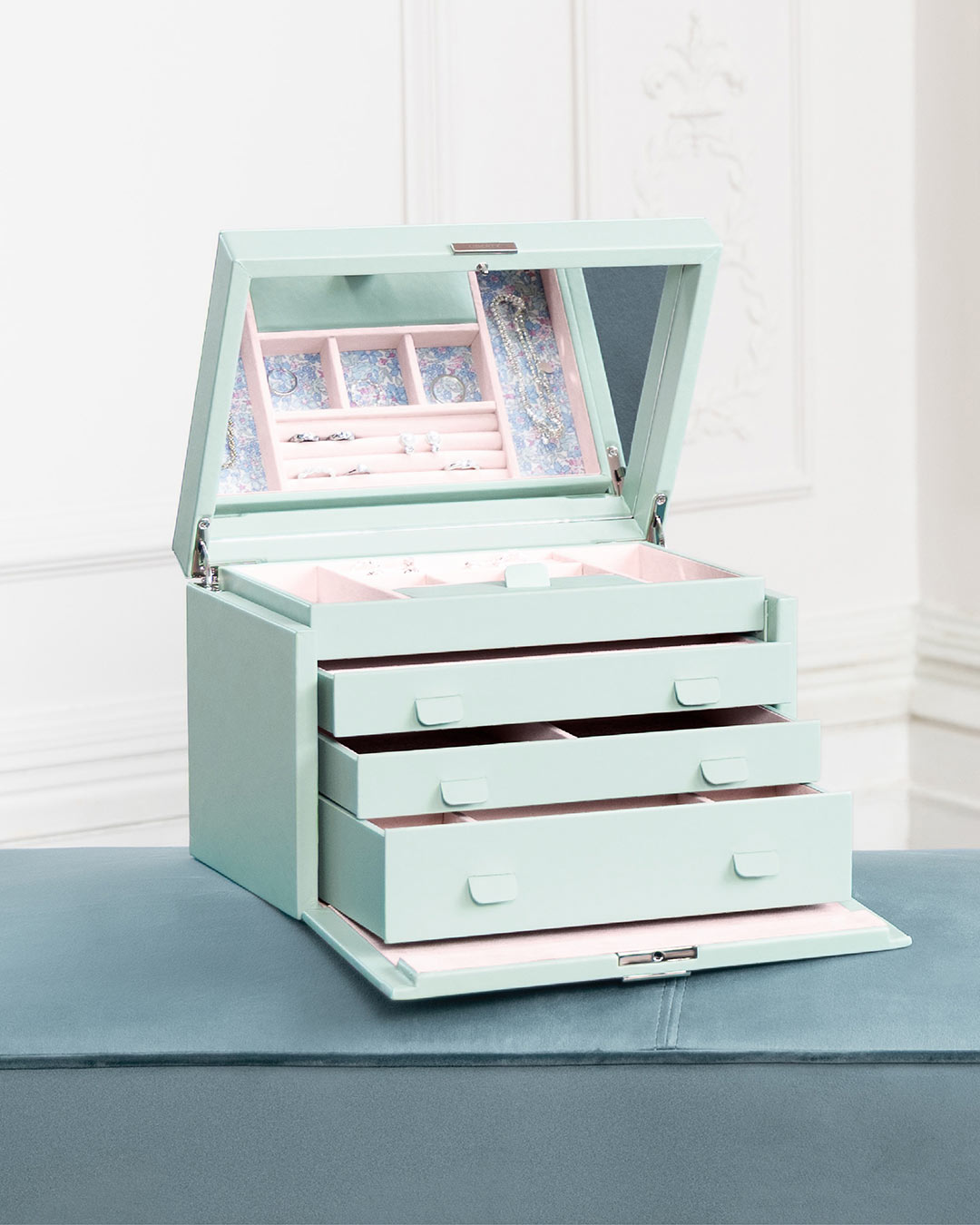 - Uložení: vyjímatelný tác s přihrádkami, prostorné komory, skryté schránky, držáky na prsteny, háčky a kapsičky na náhrdelníky, skládací zrcátko