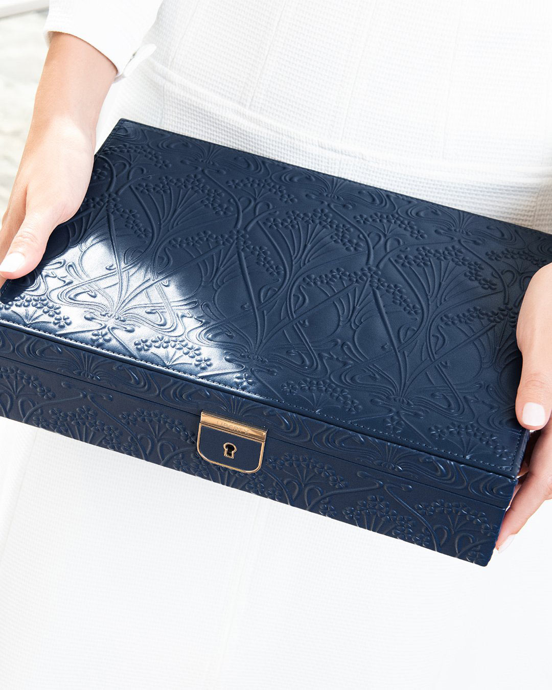 Box na šperky WOLF x Liberty Medium Jewellery 381127 je elegantní šperkovnice v kompaktní velikosti, vzniklá ve spolupráci značky WOLF s londýnským domem Liberty. Projekt se vyznačuje vytříbeným burgundovým odstínem a raženým vzorem inspirovaným charakteristickou estetikou Liberty, díky čemuž celek získává jedinečný, nadčasový charakter.