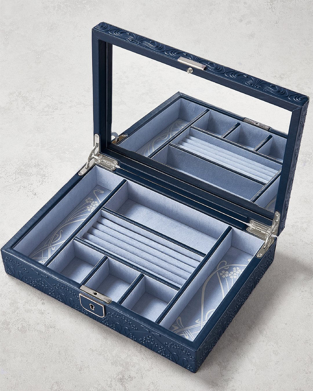 Interiér byl dokončen ve světle fialovém odstínu a rozdělen na praktické sekce: 4 válečky na prsteny, 6 přihrádek na drobné šperky a vestavěné zrcátko ve víku. Celek je vystlán inovativním materiálem LusterLoc™, který pohlcuje plyny způsobující matnění a chrání šperky až po dobu 35 let. Takový box se ideálně hodí na toaletní stolek, do elegantní šatny nebo jako luxusní dárek pro znalkyni šperků.