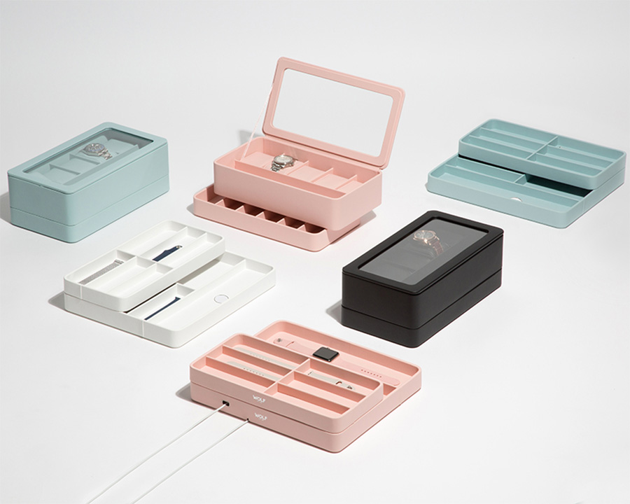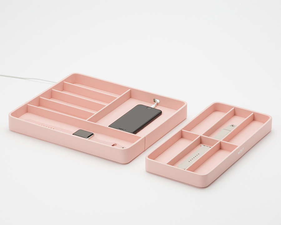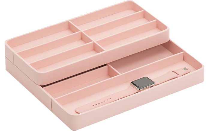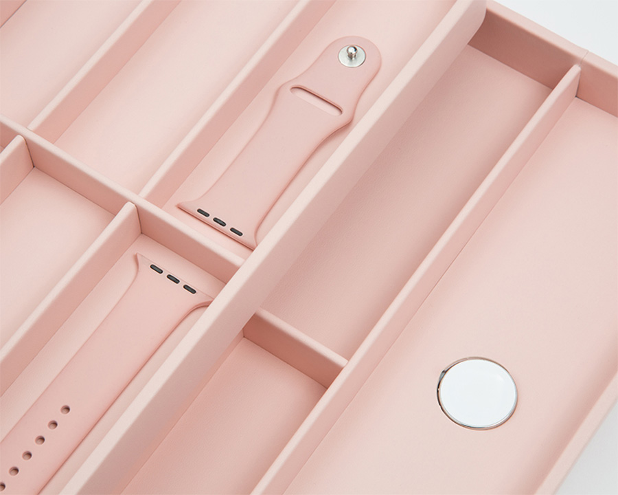 Exkluzivní růžová krabička pro Apple Watch. Byl vytvořen pro vývoj chytrých hodinek. Jedinečný design a kvalitní zpracování, které dodají závan čerstvého vzduchu každému interiéru. S 10 přihrádkami pro řemínky Apple Watch, plus nabíjecím portem pro iPhone a vestavěnou bezdrátovou indukční nabíječkou pro vaše Apple Watch máte vše, co potřebujete, na jednom soudržném místě.