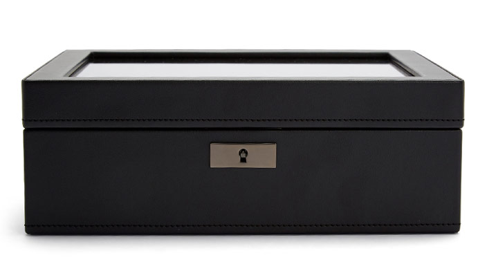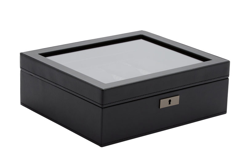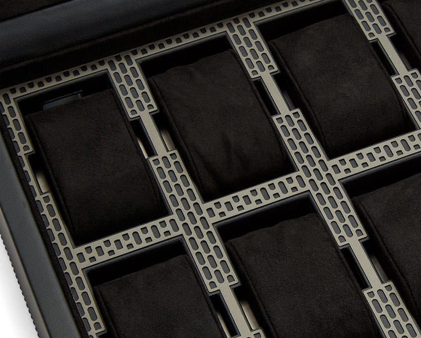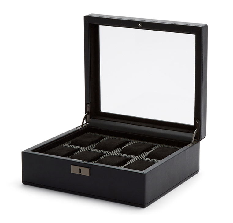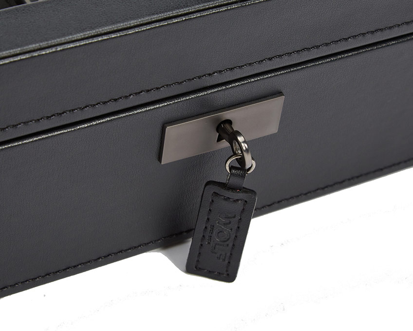 Exkluzivní box WOLF Axis 488003 na 8 hodinek . Krabice s práškovým nástřikem a řezaná laserem. Krabička na hodinky WOLF Axis je potažena veganskou kůží. Nejvyšší úroveň ruční estetiky. Černá krabička se skleněným víkem, které se zamyká na klíček a USB portem pro nabíjení chytrých hodinek - smartwatch.