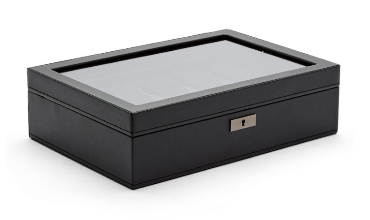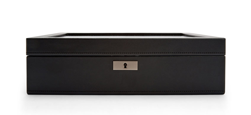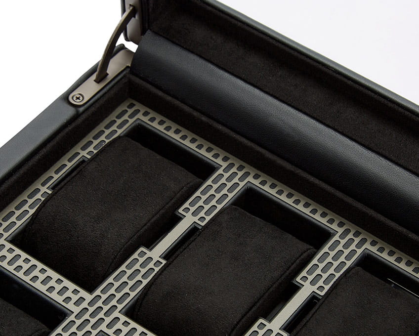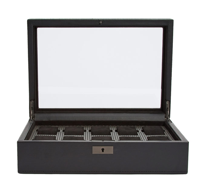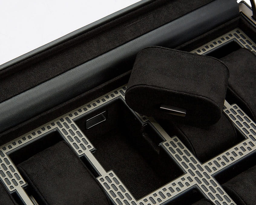 Exkluzivní box WOLF Axis 488103 na 10 hodinek . Krabice s práškovým nástřikem a řezaná laserem. Krabička na hodinky WOLF Axis je potažena veganskou kůží. Nejvyšší úroveň ruční estetiky. Černá krabička se skleněným víkem, které se zamyká na klíček a USB portem pro nabíjení chytrých hodinek - smartwatch.