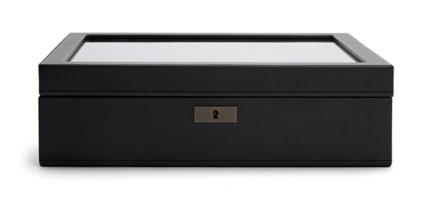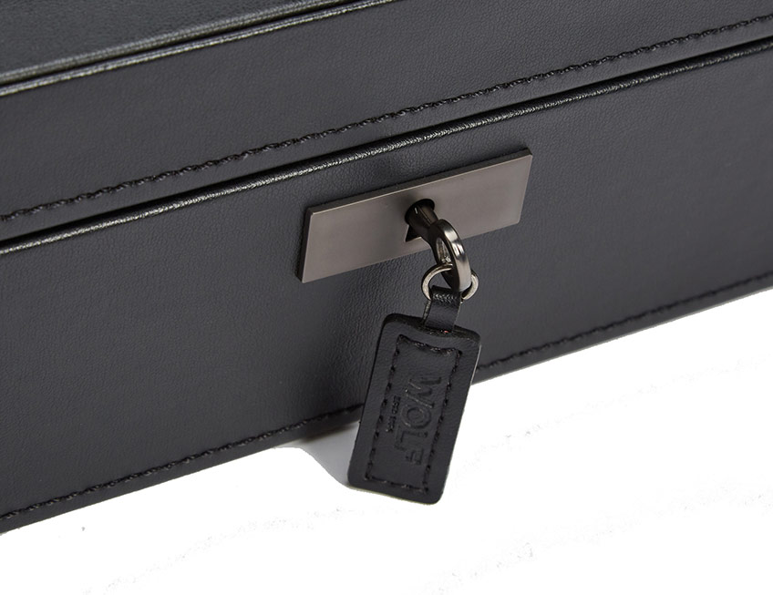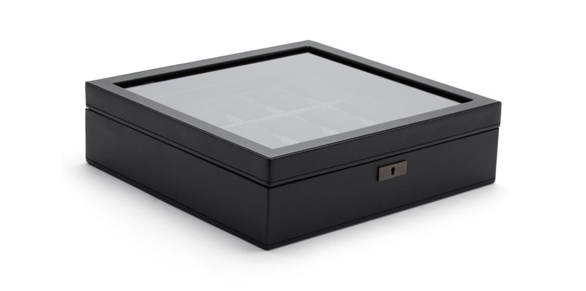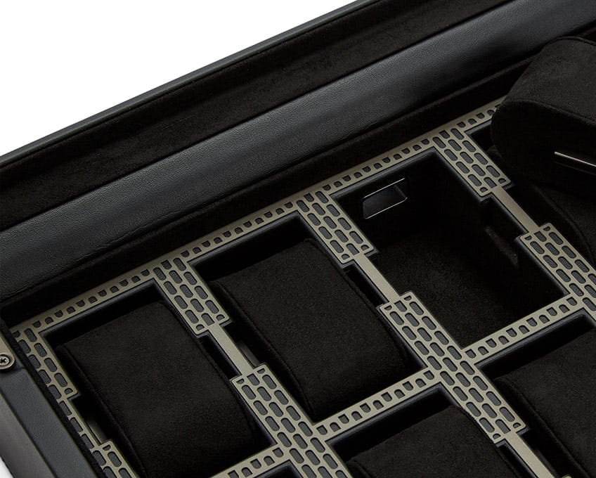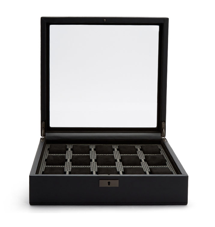 Exkluzivní box WOLF Axis 488303 na 15 hodinek . Krabice s práškovým nástřikem a řezaná laserem. Krabička na hodinky WOLF Axis je potažena veganskou kůží. Nejvyšší úroveň ruční estetiky. Černá krabička se skleněným víkem, které se zamyká na klíček a USB portem pro nabíjení chytrých hodinek - smartwatch.