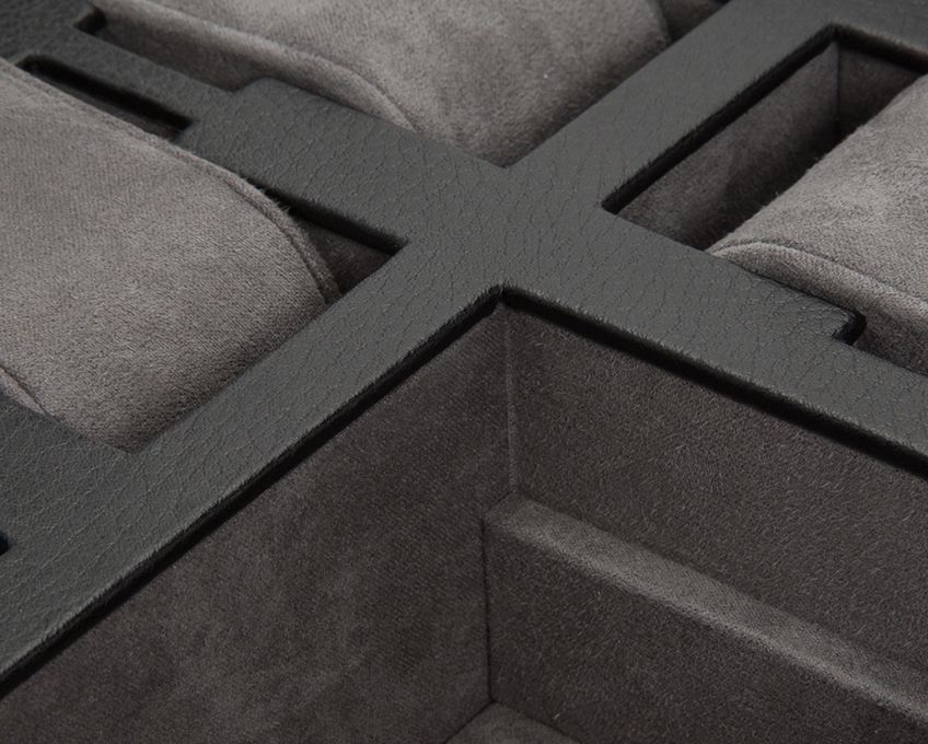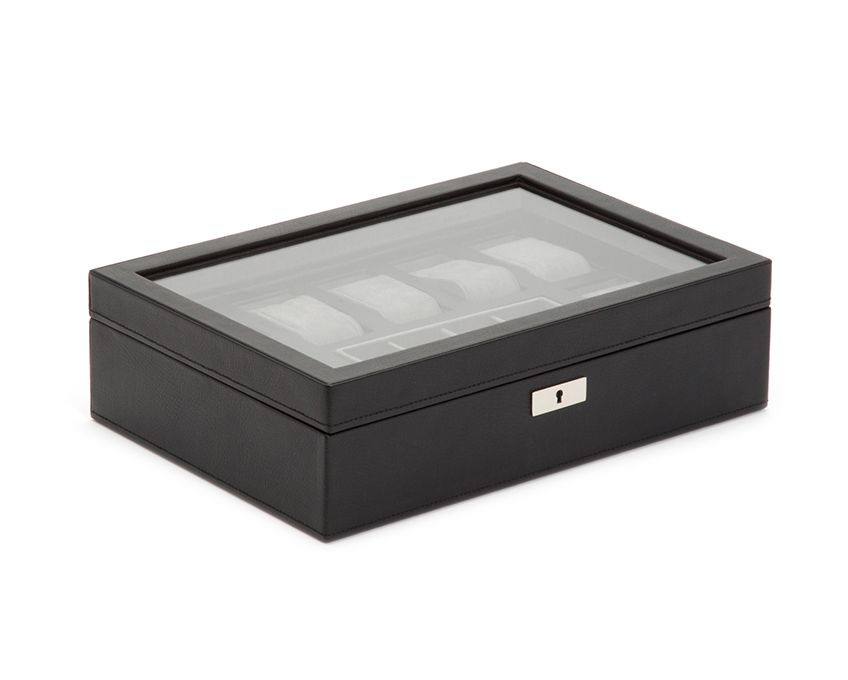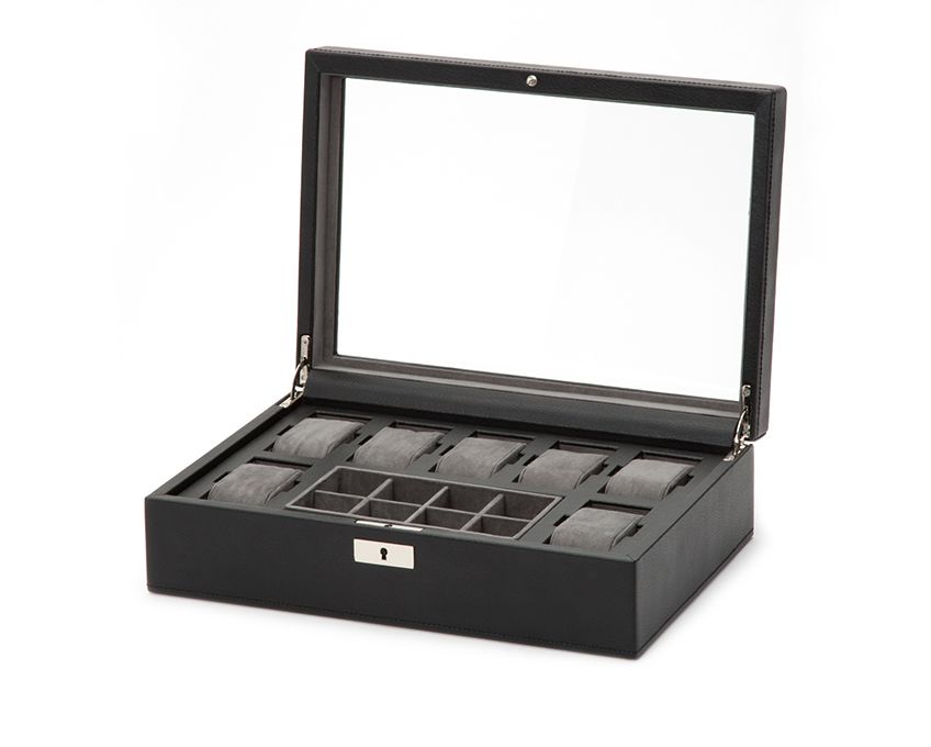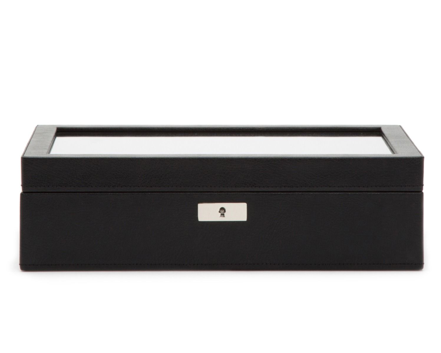 Exkluzivní box WOLF Howard 465203 v černé barvě . Skvělý způsob, jak stylově ochránit hodinky a šperky. K dispozici je 7 míst pro libovolné hodinky a 8 přihrádek na manžetové knoflíčky, pečetě nebo jiné drobnosti. Kolekce WOLF Howard je zaměřena na moderního muže, který si cení spořádaného životního stylu. Krabička hodinek se vyznačuje chromovaným hardwarem, ultra semišovým vnitřkem a uzamykatelným skleněným krytem, který dodá eleganci a sofistikovanost každému interiéru.