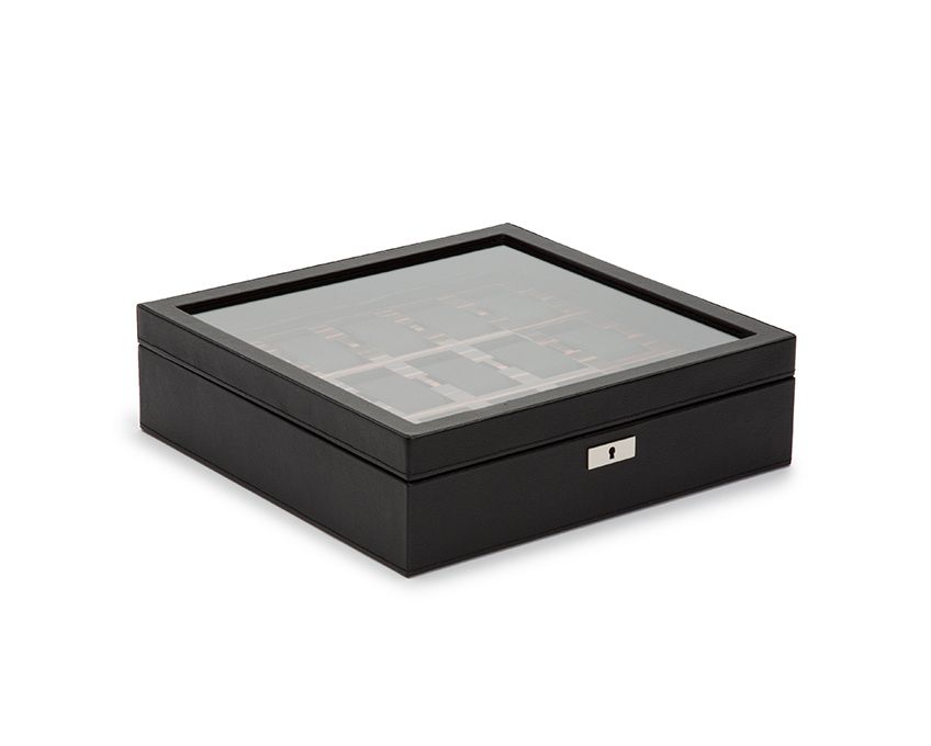 Exkluzivní box WOLF Roadster 477756 na 15 hodinek . Inspirováno nejlepšími britskými vozy Jaguar, Aston Martin a Bristol. Krabička na hodinky WOLF Roadster je potažena veganskou kůží s detaily v leštěném macassarovém ebenovém dřevě. Nejvyšší úroveň ruční estetiky. Černá krabička se skleněným víkem uzavřená klíčem.