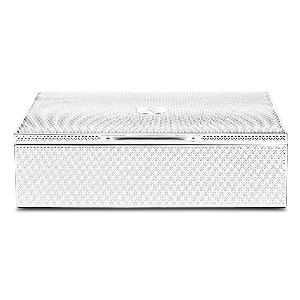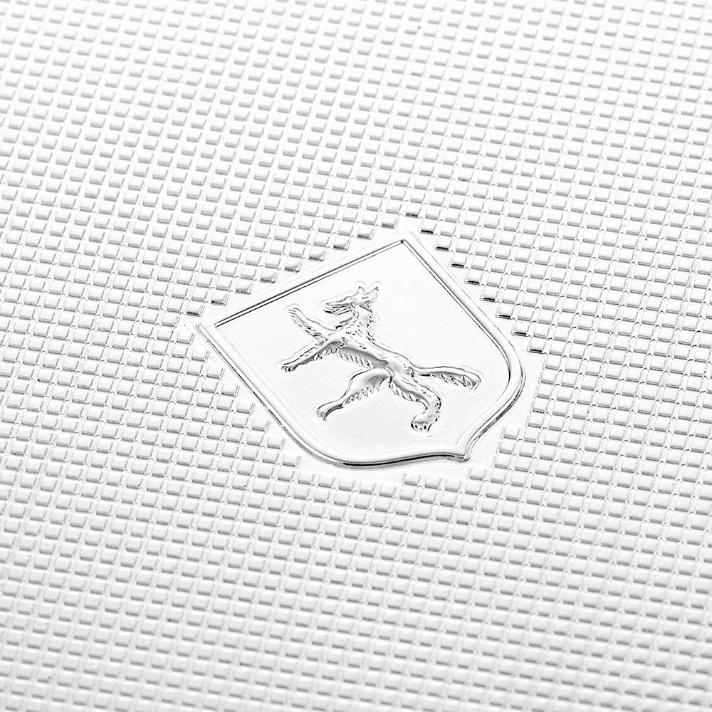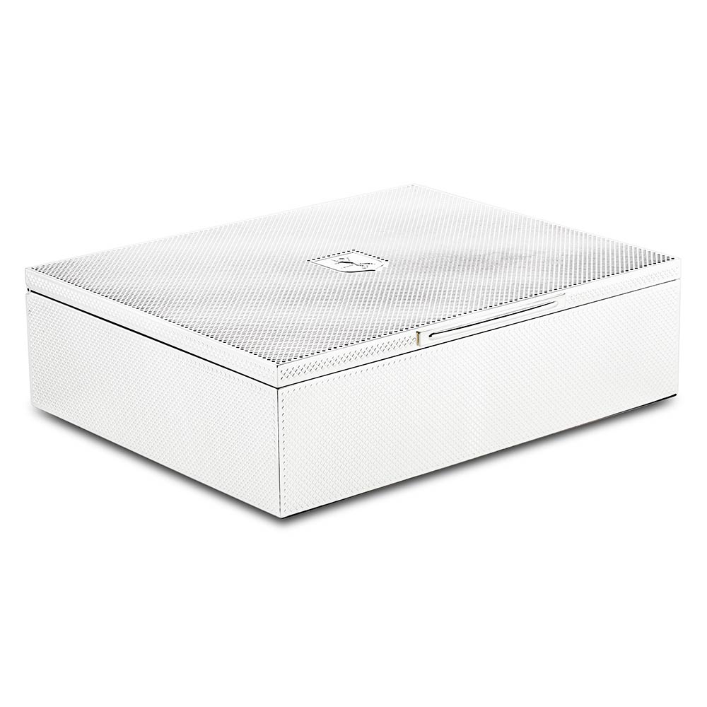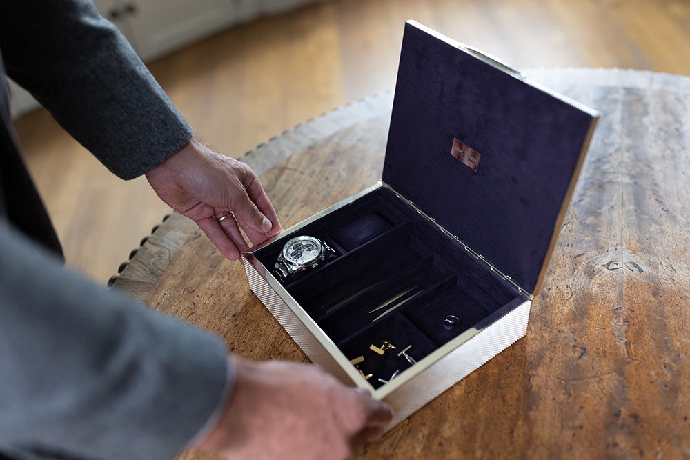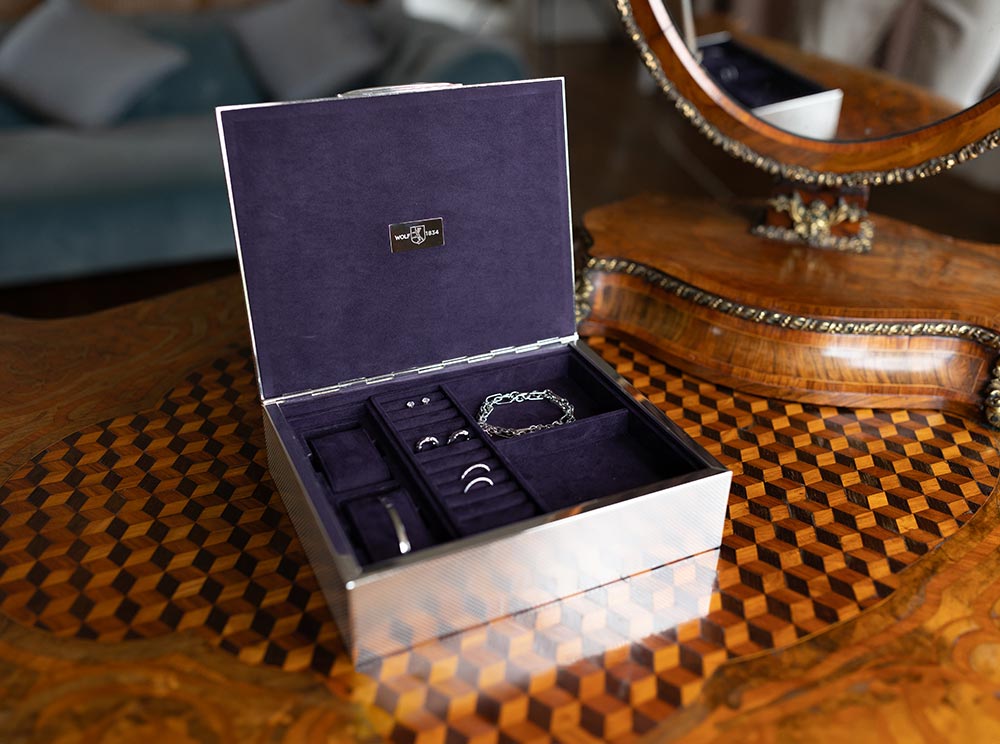 Vnitřek obsahuje vyjímatelné tácky se dvěma zavěšenými manžetami hodinek, přihrádky na prsteny a četné malé přihrádky na šperky, pera, manžetové knoflíčky a další drobnosti. Krabičku zdobí exkluzivní erb WOLF u příležitosti 190. výročí značky , vyrytý nahoře, na zadní straně a uvnitř obálky. Stříbro je dokonalým dekorativním prvkem, který dodá eleganci každému interiéru.