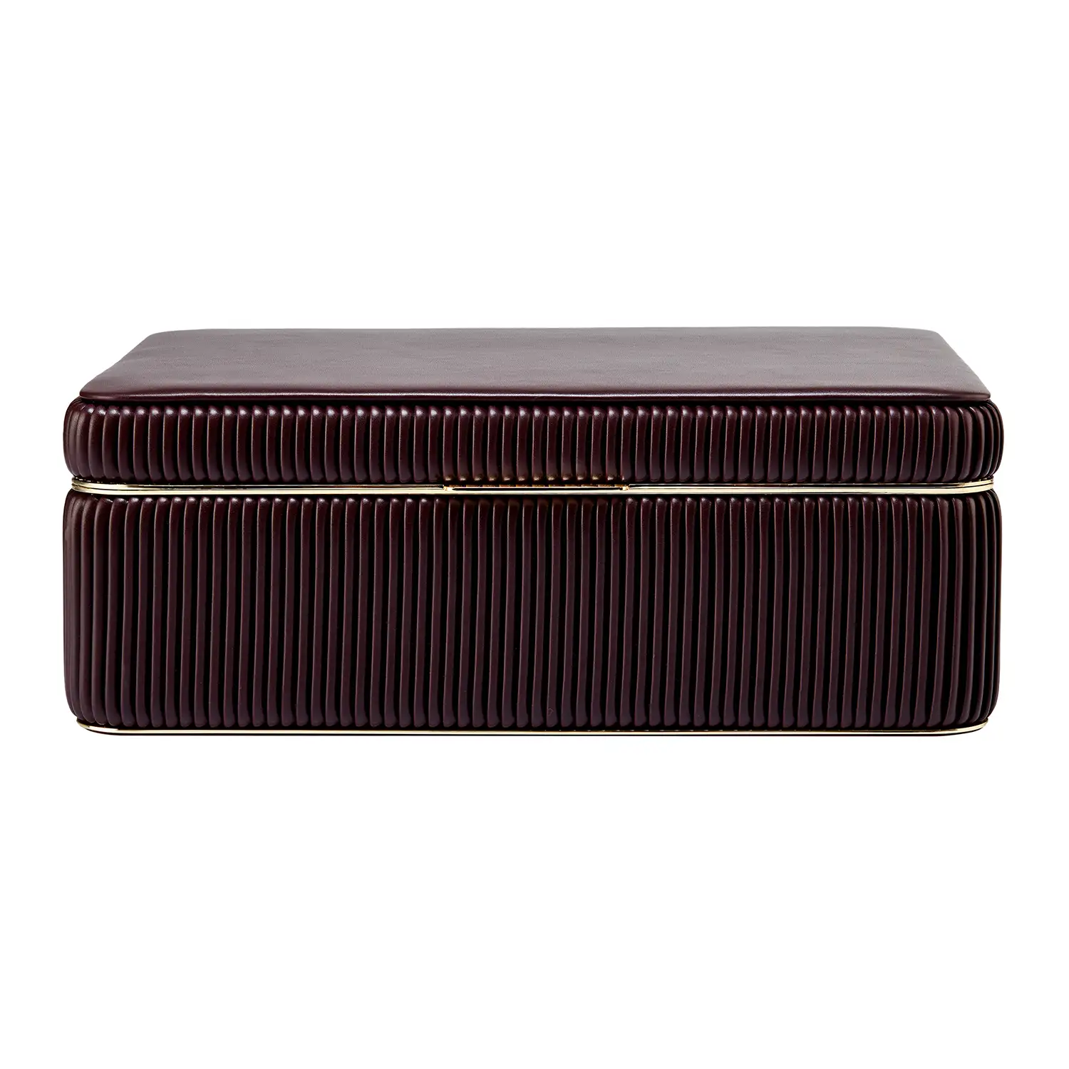 WOLF Bella 781226 je velký box na šperky, který zaujme elegancí i praktičností. Hladké víko z veganské kůže v hlubokém bordó odstínu, precizně plisované boky a zlaté detaily dodávají celku luxusní charakter. Je to volba pro ženy, které hledají nejen estetiku, ale i funkční řešení.