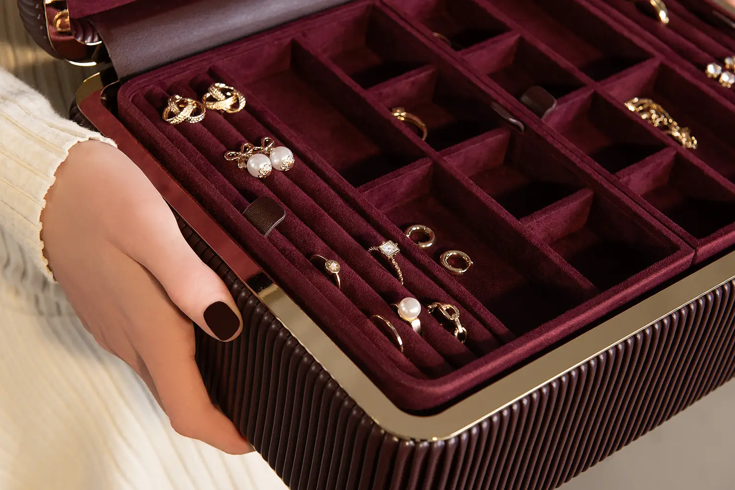 Interiér je vyložen materiálem LusterLoc™, který chrání šperky před zmatněním až po dobu 35 let. Tři vyjímatelné tácky umožňují perfektní uspořádání prstenů, náušnic, náhrdelníků a náramků, zatímco prostorný spodní úložný prostor pod posledním táckem je ideální pro větší předměty. Celek doplňuje odnímatelné pouzdro se čtyřmi kapsičkami – ideální na cesty.