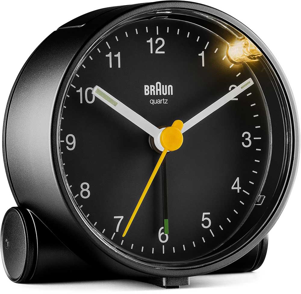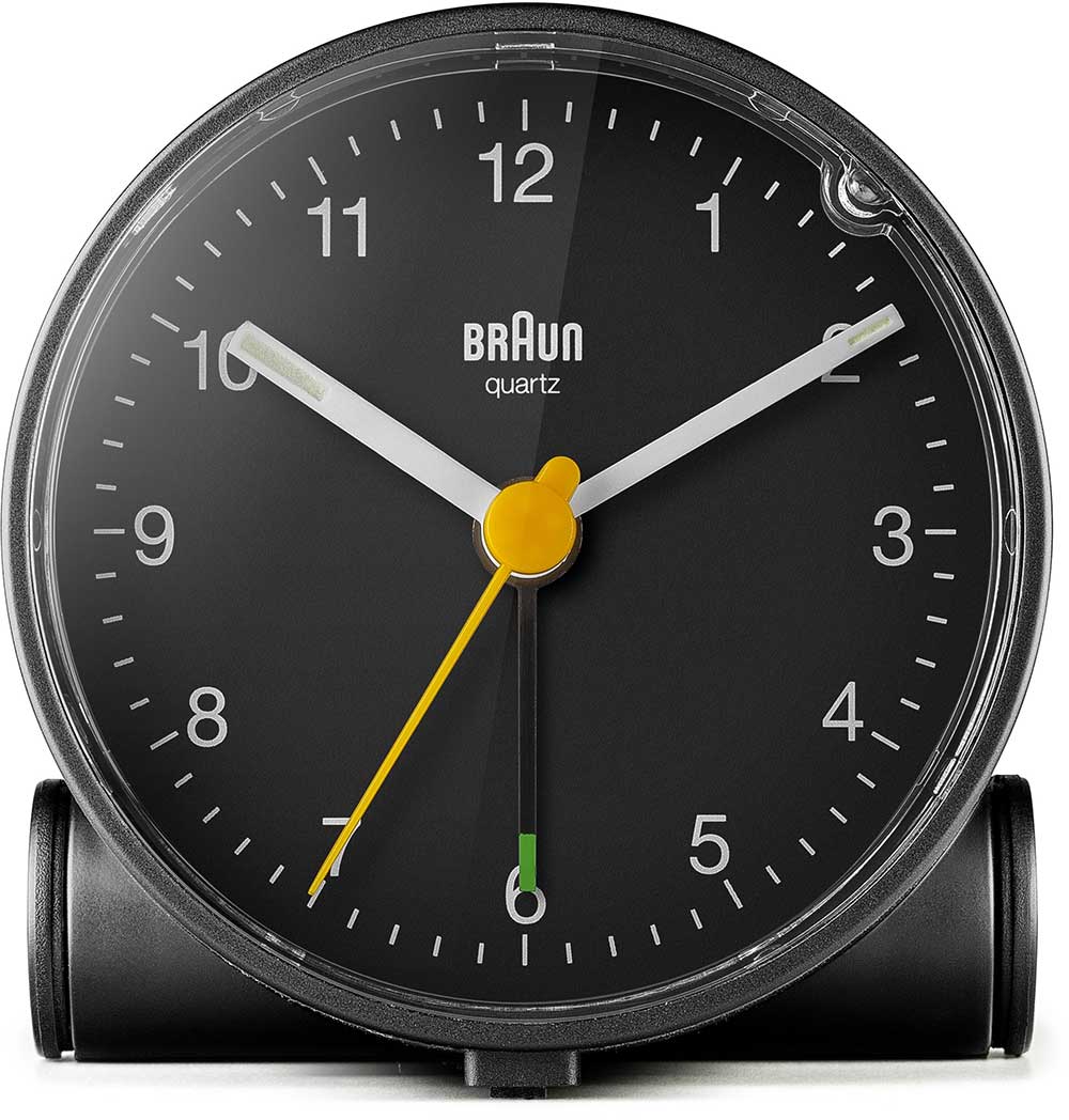 Klasický kulatý budík Braun BC01B . Černé pouzdro a ciferník, bílé ručky, žlutá vteřinovka a černá ručička budíku. Budík má tichý bateriový strojek quartz německé výroby s budíkem v podobě ručičky.
