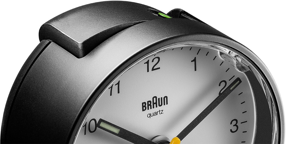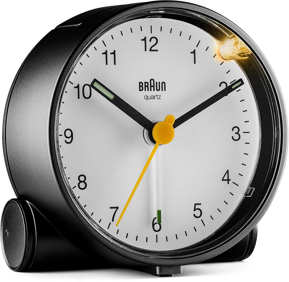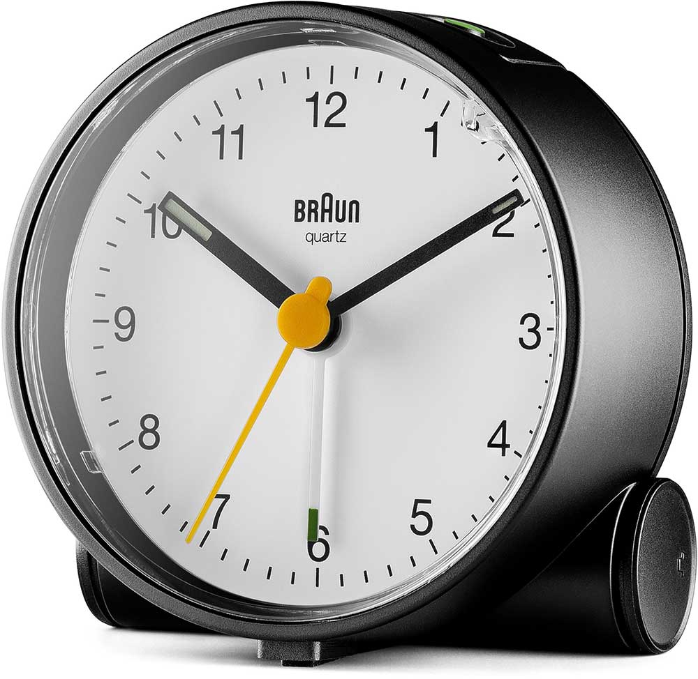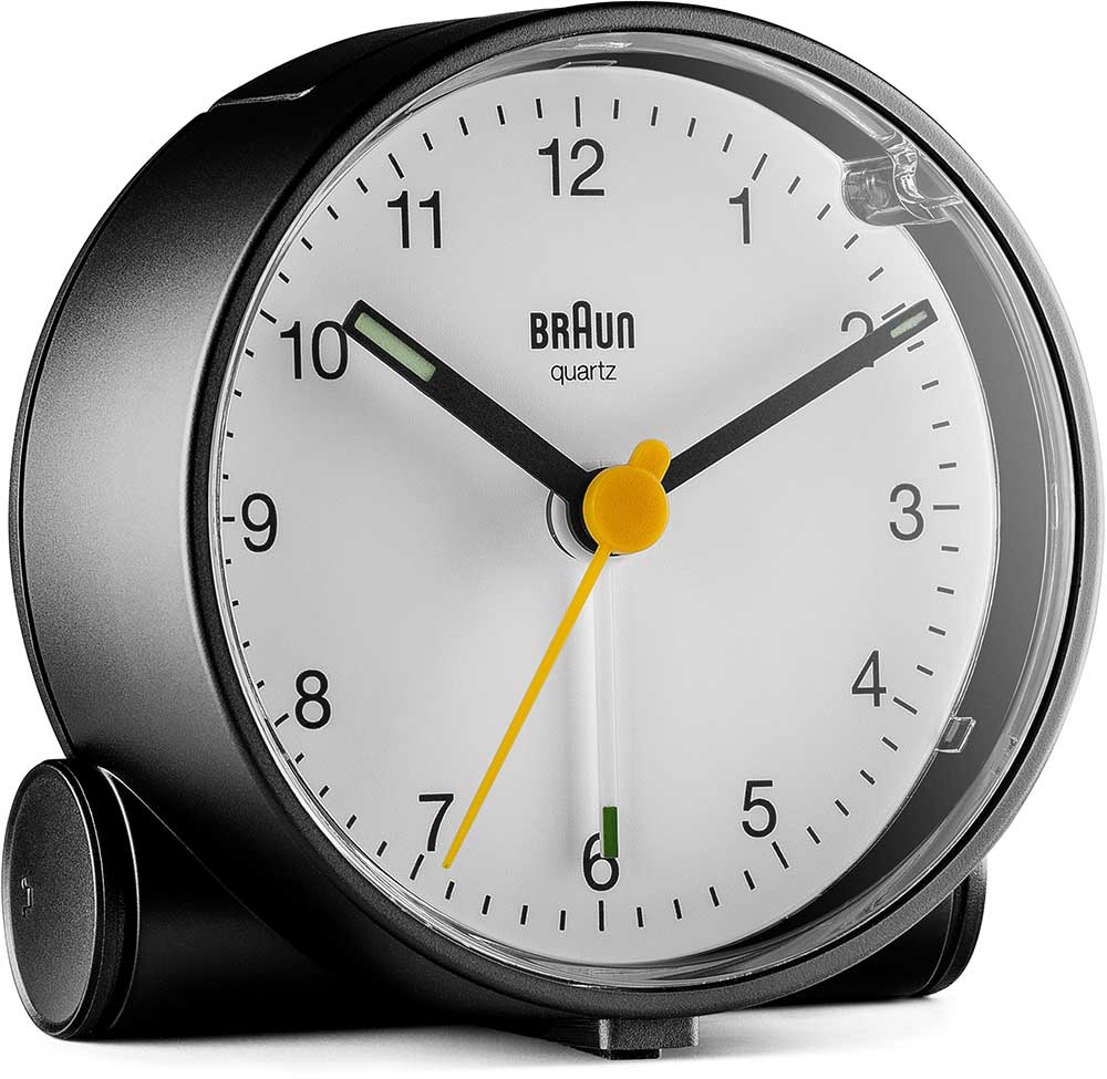 Klasický kulatý budík Braun BC01BW . Černé pouzdro a bílý ciferník, černé ručičky, žlutá vteřinovka a bílá ručička budíku. Budík má tichý bateriový strojek quartz německé výroby s budíkem v podobě ručičky.