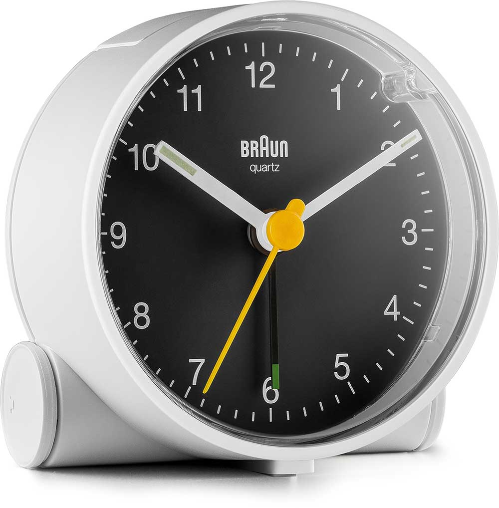 Klasický kulatý budík Braun BC01WB . Bílé pouzdro a černý ciferník, bílé ručky, žlutá vteřinovka a bílá ručička budíku. Budík má tichý bateriový strojek quartz německé výroby s budíkem v podobě ručičky.