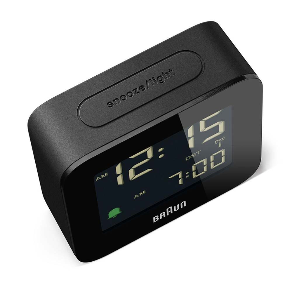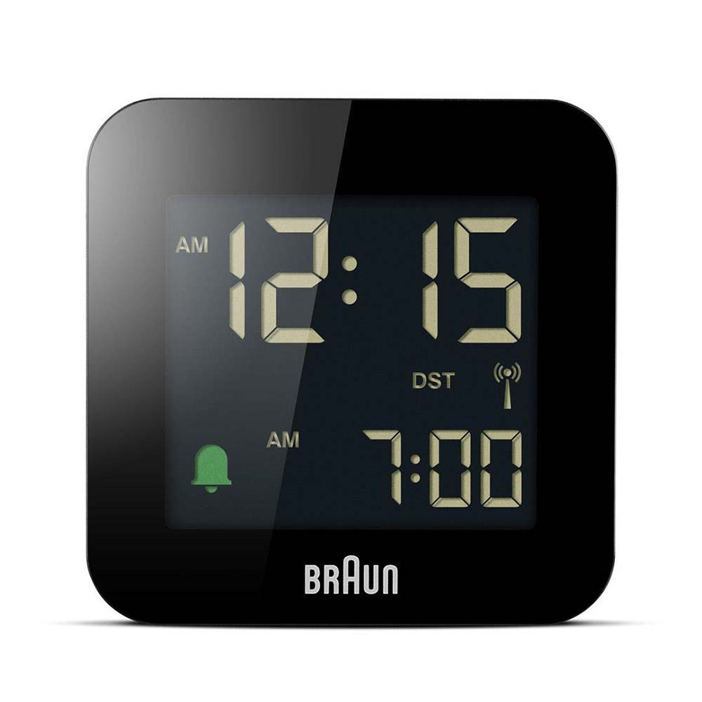 Rádiem řízený čtvercový budík Braun BC08B-DCF . Minimalistická, čistá estetika Braun je postavena na étosu značky „méně, ale lépe“. Se všemi prvky navrženými pro uživatelskou přívětivost je digitální budík BC08B-DCF nápadným příkladem nadčasového designu Bauhaus společnosti Braun.