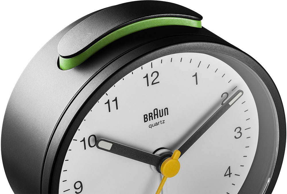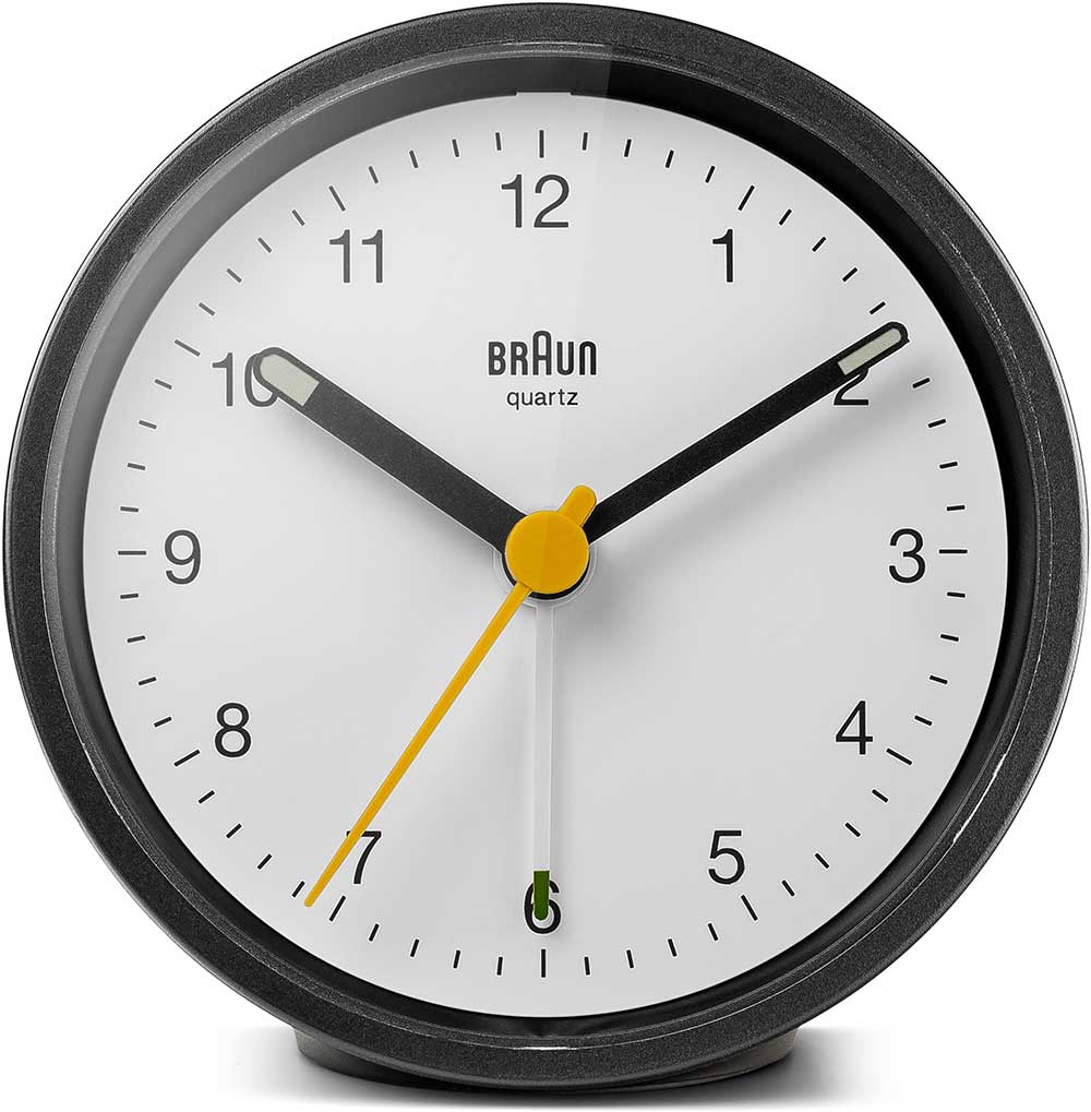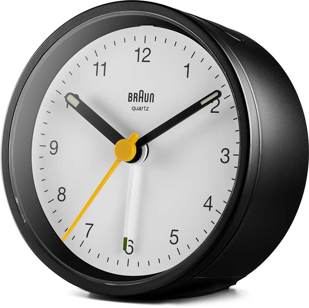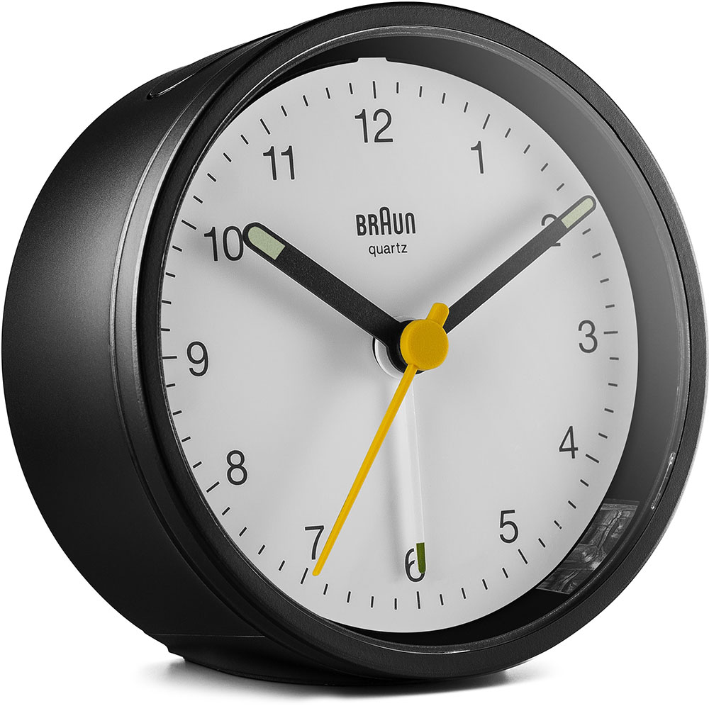 Klasický kulatý budík Braun BC12BW . Černé pouzdro ukrývá čitelný bílý ciferník s kontrastními černými ručičkami. Žlutá sekundová ručička a bílý ukazatel alarmu. Budík má tichý bateriový strojek quartz německé výroby s budíkem v podobě ručičky.