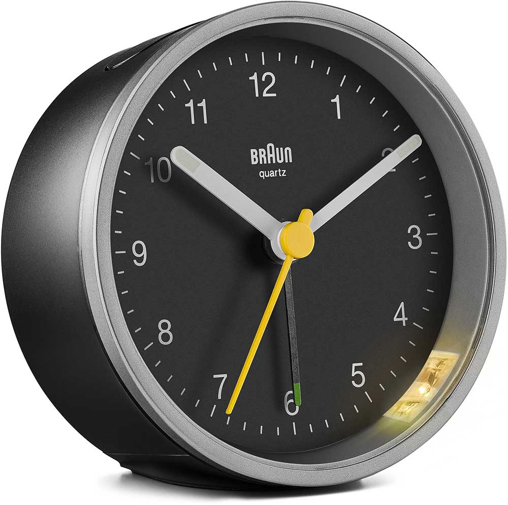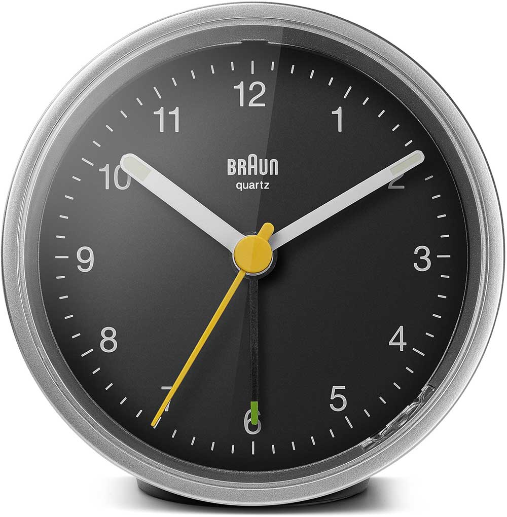 Klasický kulatý budík Braun BC12SB . Černé pouzdro a ciferník se stříbrným lemem, stříbrné ručičky, žlutá vteřinovka a černá ručička budíku. Budík má tichý bateriový strojek quartz německé výroby s budíkem v podobě ručičky.