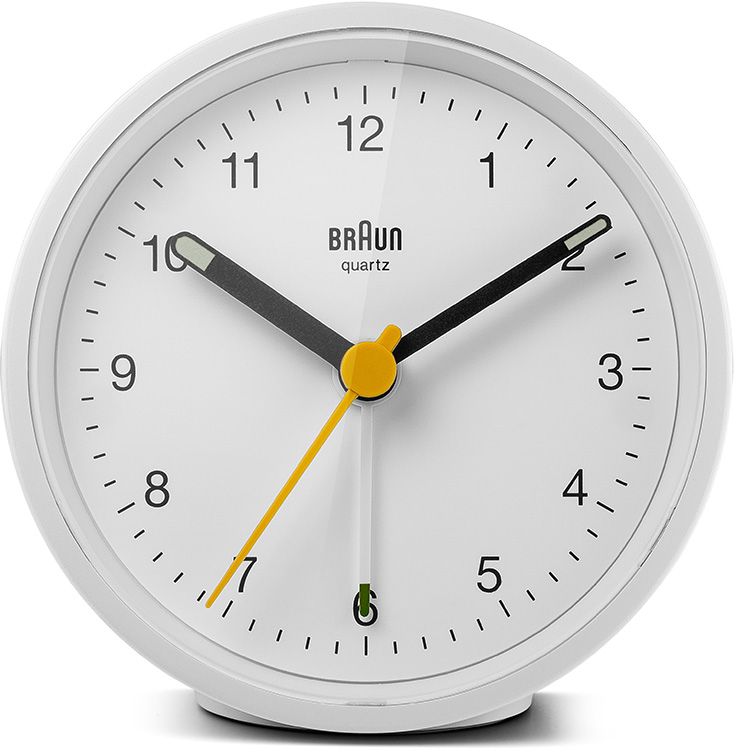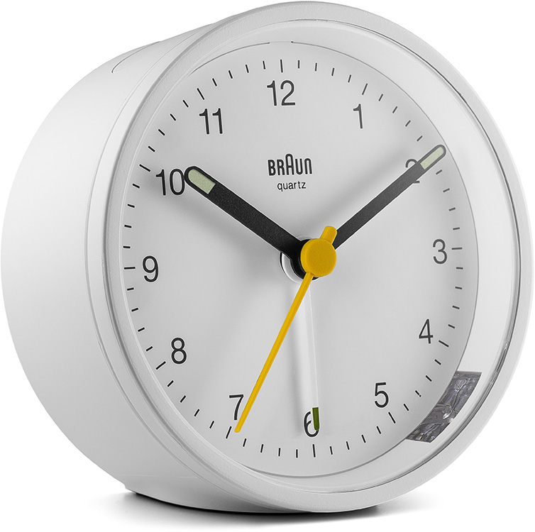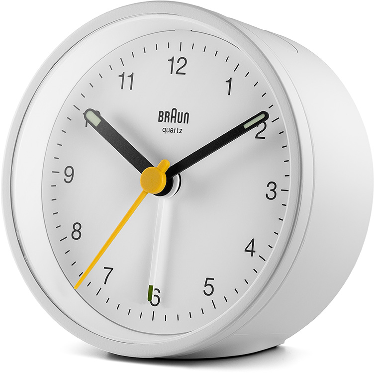 Klasický kulatý budík Braun BC12W . Bílé pouzdro a ciferník, černé ručičky, žlutá vteřinovka a bílá ručička budíku. Budík má tichý bateriový strojek quartz německé výroby s budíkem v podobě ručičky.