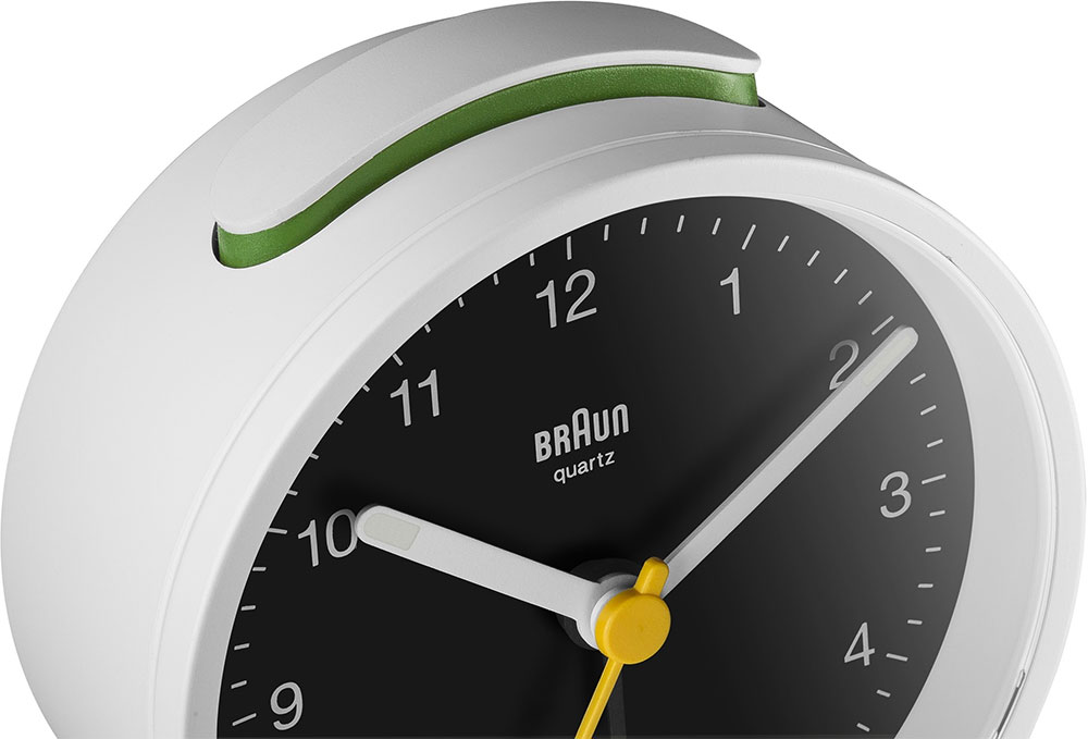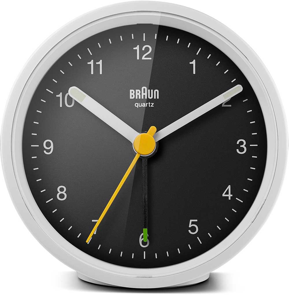 Klasický kulatý budík Braun BC12WB . Bílé pouzdro a černý ciferník, bílé ručky, žlutá vteřinovka a černá ručička budíku. Budík má tichý bateriový strojek quartz německé výroby s budíkem v podobě ručičky.