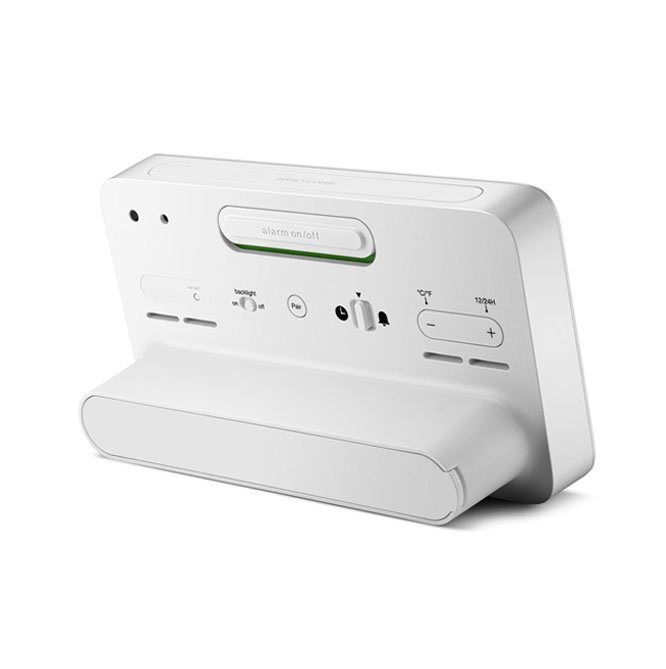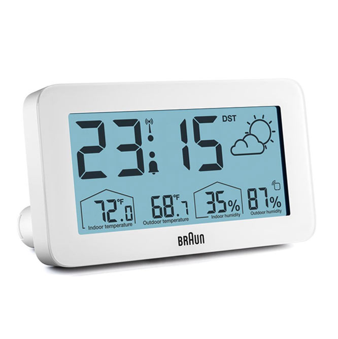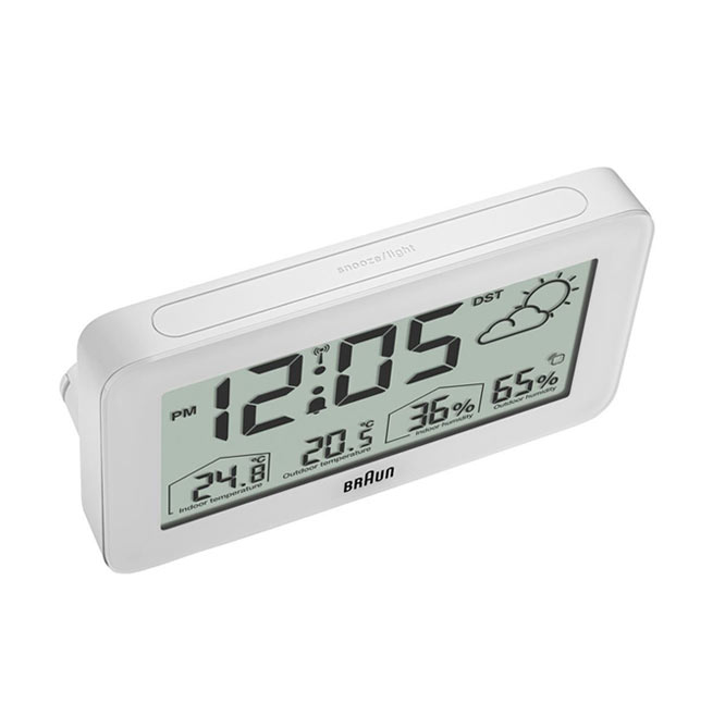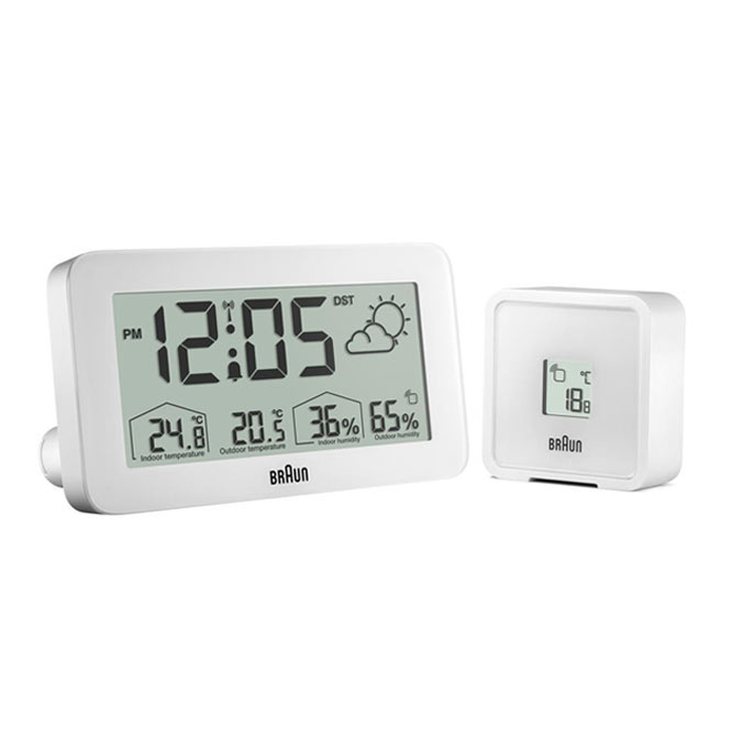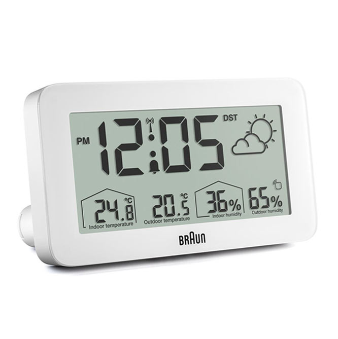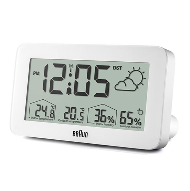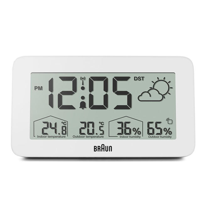 Minimalistické bílé hodiny Braun rádiem řízené digitální meteorologické stanice jsou digitální meteostanice s negativním LCD displejem s nepřetržitým podsvícením za špatných světelných podmínek pro maximální viditelnost v noci. Digitální budík na počasí Braun je vybaven rádiovým ovládáním DCF pro středoevropské časové pásmo, které zajišťuje vždy nejvyšší přesnost. Digitální rádiem řízený budík lze nastavit na 12 nebo 24 hodinové zobrazení času. BC13WP-DCF obsahuje konfigurovatelné rozhraní, které může zobrazovat vnitřní a venkovní teplotu (°C nebo °F), stejně jako vnitřní a venkovní vlhkost. Venkovní čidlo má také zobrazení teploty.
