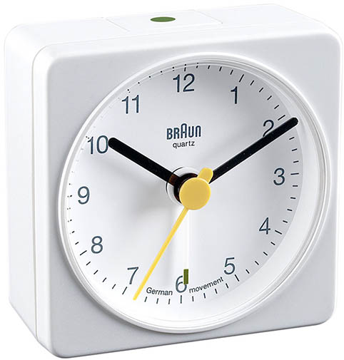 Klasický cestovní budík Braun BNC002WHWH s minimalistickým designem a velmi čitelným ciferníkem. Vybaveno německým bateriovým quartz strojkem s alarmem v podobě ručičky.