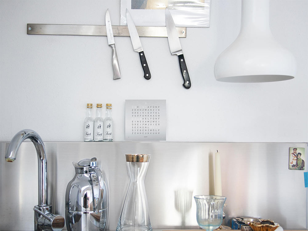 Hodiny lze nastavit ručně pomocí tlačítek na zadní straně nebo pomocí bezplatné aplikace Flashsetter pro váš smartphone (Android, iOS). Po jeho spuštění stačí telefon přiložit ke speciálnímu senzoru na zadním panelu a Qlocktwo Touch si z vašeho smartphonu automaticky stáhne aktuální čas. Každý kus je ručně vyroben v továrně BIEGERT &