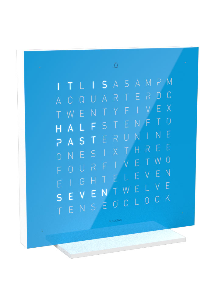 Qlocktwo Earth 13.5 Pure Blue Candy je přesný, dotykový budík do kanceláře, obývacího pokoje nebo ložnice. Stejně jako hodiny z kolekce Earth i matice zobrazuje čas ve formě psaných slov, která díky moderní LED technologii svítí čistě bílou barvou. Jedná se o zcela novou, přátelskou formu zobrazení času. Výrobní proces těchto hodin je na nejvyšší světové úrovni. Monolitické tělo je vyrobeno z jediného bloku hliníku, což je milník v estetice stolních hodin. Za přesnost zobrazeného času je zodpovědná precizní technologie quartz.