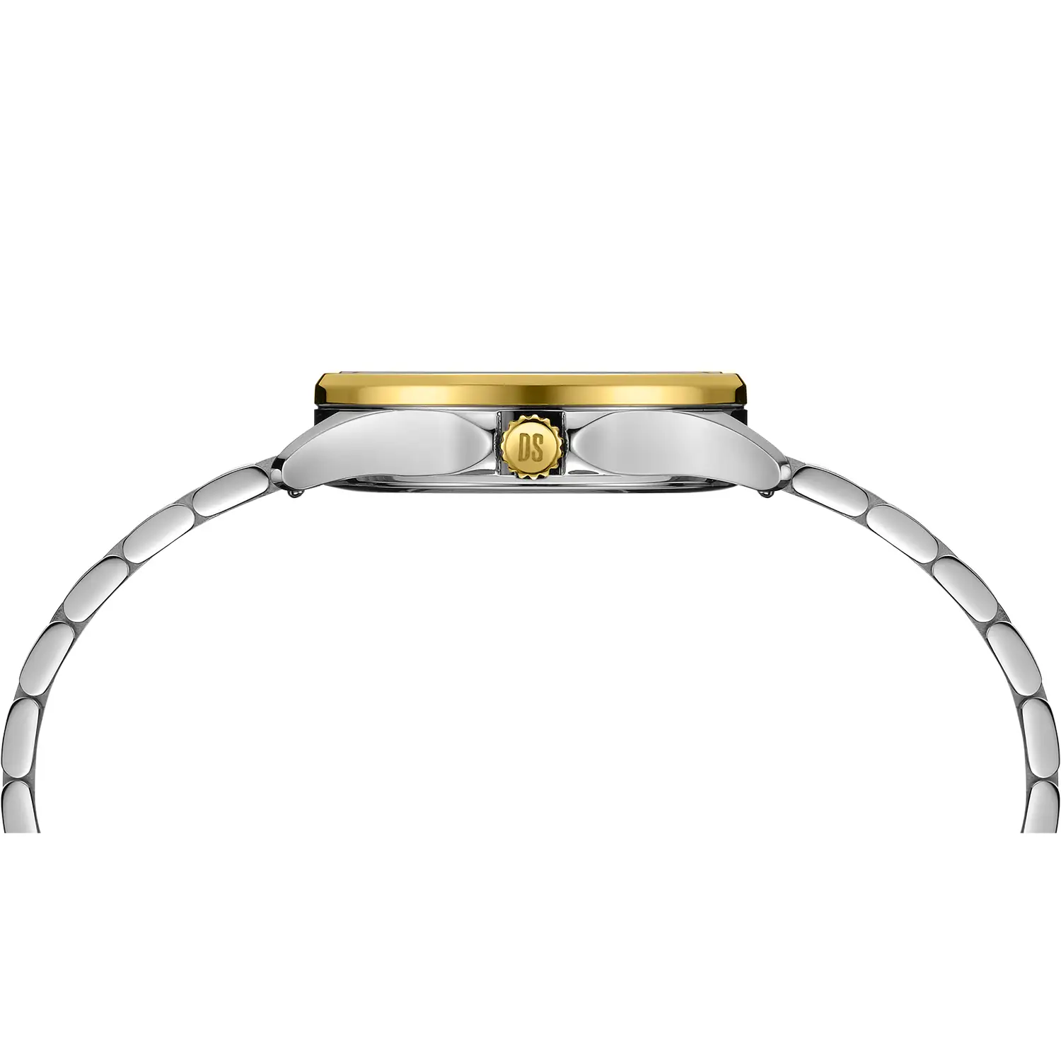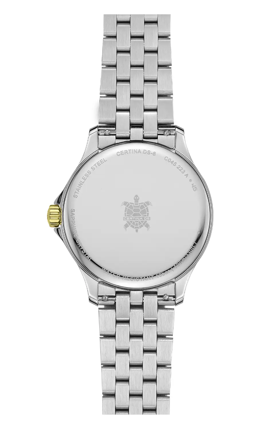 Pouzdro o kompaktním průměru 32 mm je vyrobeno z ušlechtilé oceli a spojeno s pevným pětiřadým náramkem se střídavě kartáčovanými a leštěnými články. Luneta a střední články náramku jsou pokryty povlakem PVD ve zlaté barvě, což dodává celku šperkový charakter, ale zároveň posiluje materiál. Safírové sklíčko s antireflexní vrstvou zajišťuje čitelnost v každých podmínkách a ocelové víko s charakteristickou želvou Certina připomíná odolnost systému DS. Patentovaný systém DS je doplněn vodotěsností do 100 metrů, díky čemuž zde jde elegance ruku v ruce s praktičností.