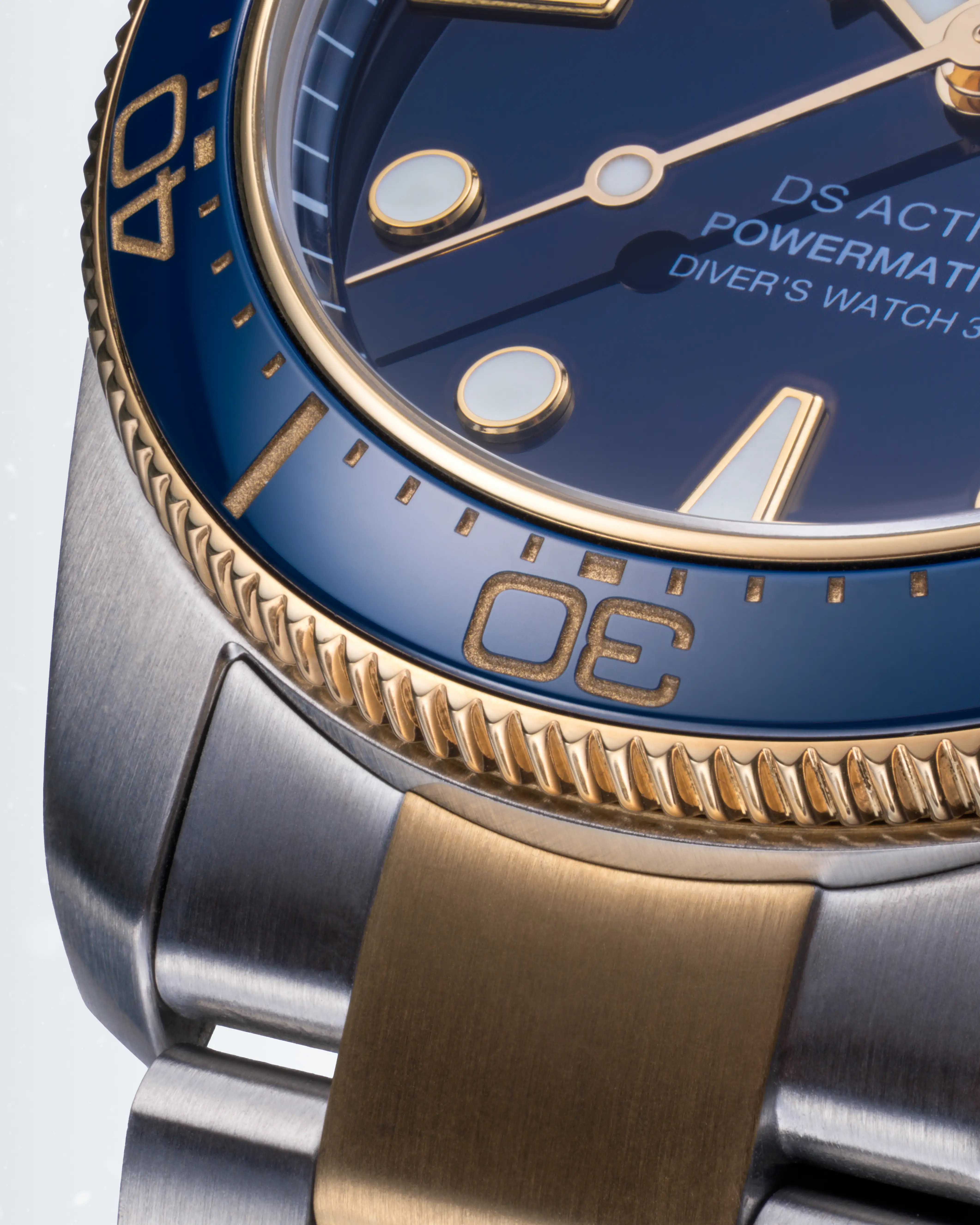 Kompaktní pouzdro o průměru 38 mm je vyrobeno z ušlechtilé oceli a vybaveno pozlacenou otočnou potápěčskou lunetou s keramickou vložkou, šroubovací korunkou a plným ocelovým víkem s gravírovanou želvou – symbolem odolnosti systému DS. Safírové sklíčko s antireflexní vrstvou chrání ciferník před poškrábáním a vodotěsnost na úrovni 300 metrů umožňuje sestupovat do hlubin bez obav o spolehlivost mechanismu. Bicolor náramek z nerezové oceli má pevnou motýlkovou sponu s možností prodloužení, což umožňuje pohodlné nošení hodinek na neoprenu. Disponuje také systémem rychlé výměny, který umožňuje bez použití nástrojů rychle a snadno sejmout náramek a vyměnit ho za nový nebo za vybraný řemínek.