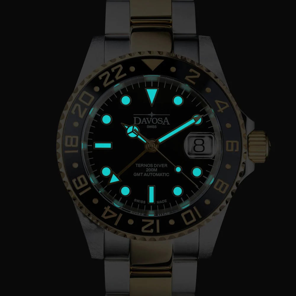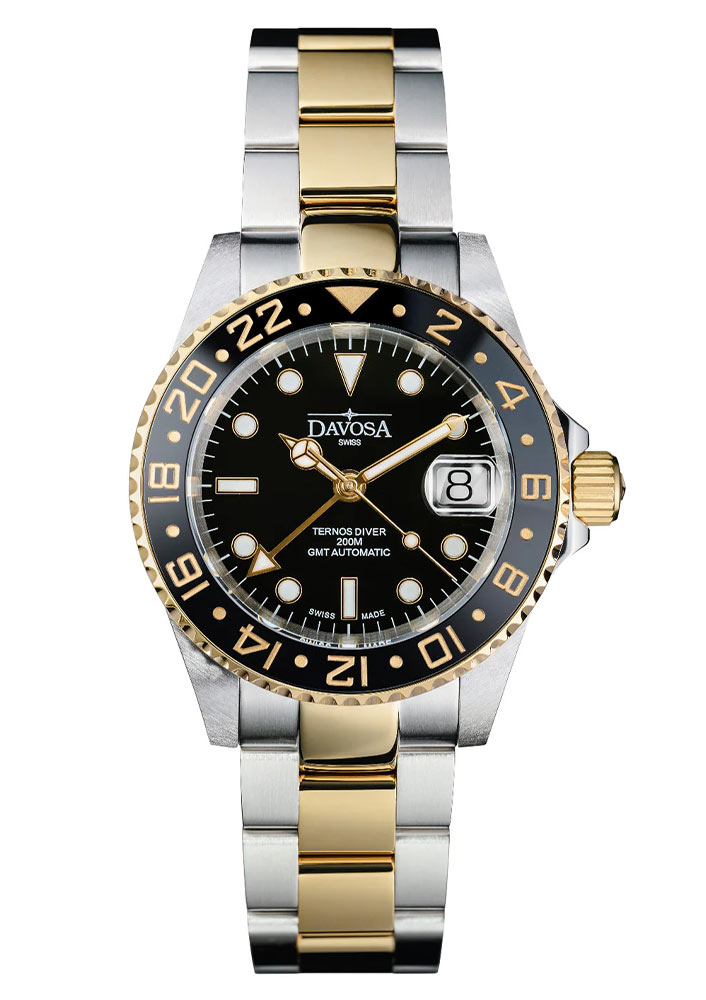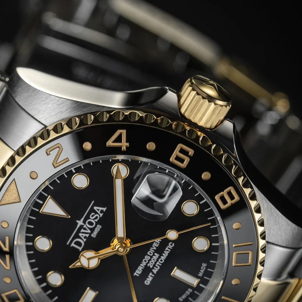 Davosa Ternos Ceramic GMT Automatic 161.591.50.W jsou hodinky, které dokazují, že profesionální potápěč může být zároveň luxusním doplňkem. Kombinace ušlechtilé oceli s pozlacenými prvky dodává modelu výjimečně důstojný vzhled, přičemž si zachovává plně funkční charakter. Ideální volba pro muže, kteří hledají nástrojové hodinky, ale nechtějí se vzdát elegance.