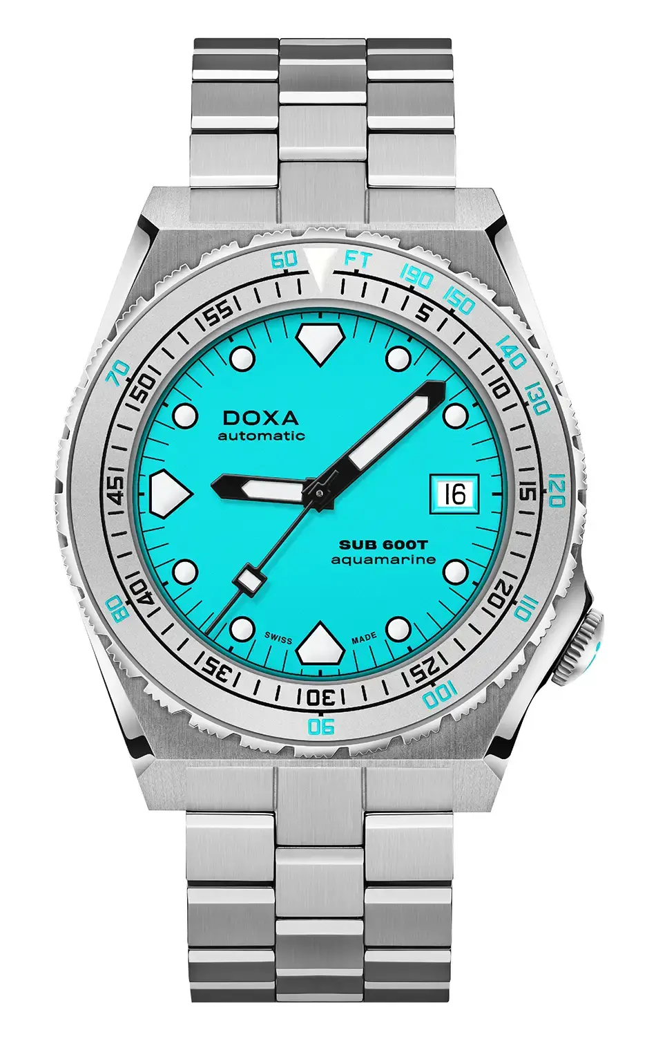 DOXA SUB 600T je znovuzrozena v roce 2021 – o více než 40 let později a dokáže víc než jen znovu navštívit kapitolu napsanou dávno. Značka vzdává hold ikonickému modelu SUB 600T novým příběhem, který právě vzniká. Po velkém úspěchu limitované edice titanových diverských hodinek Doxa SUB 600T Pacific Blue představuje DOXA SUB 600T v neomezené verzi, aby obohatila řadu profesionálních diverských hodinek DOXA SUB. Znovuzrozené diverské hodinky Doxa SUB 600T Aquamarine jsou modelem dostupným v odolném pouzdře z nerezové oceli 316L a s ocelovým rámem s pískovanou úpravou, uprostřed kterého se nachází dobře čitelný tyrkysový číselník.