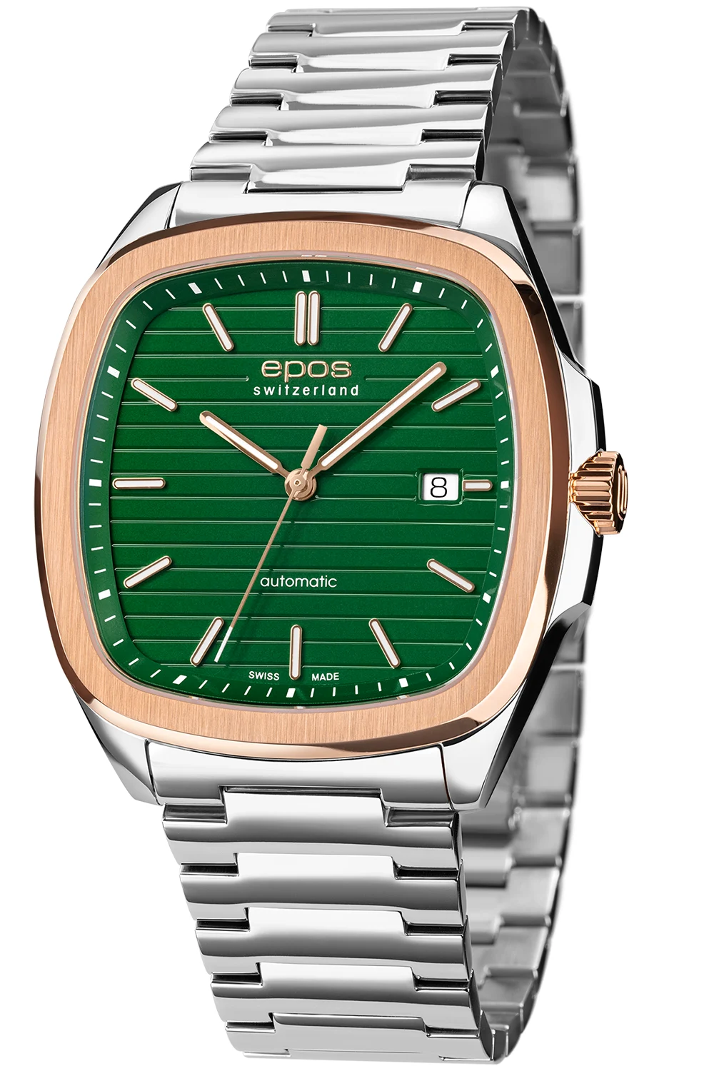 Tato verze kolekce Timeless představuje čtvercové hodinky Epos s jemně zaoblenou formou pouzdra, vyrobeného z ušlechtilé oceli s efektním povrchem v barvě růžového zlata. Zelený ciferník s horizontální giloší podtrhuje moderní charakter modelu a štíhlé indexy a datumovka na třetí hodině zajišťují vynikající čitelnost. Švýcarský automatický strojek odpovídá za plynulý chod ukazatelů a spolehlivost, kterou očekávají milovníci klasického hodinářství.