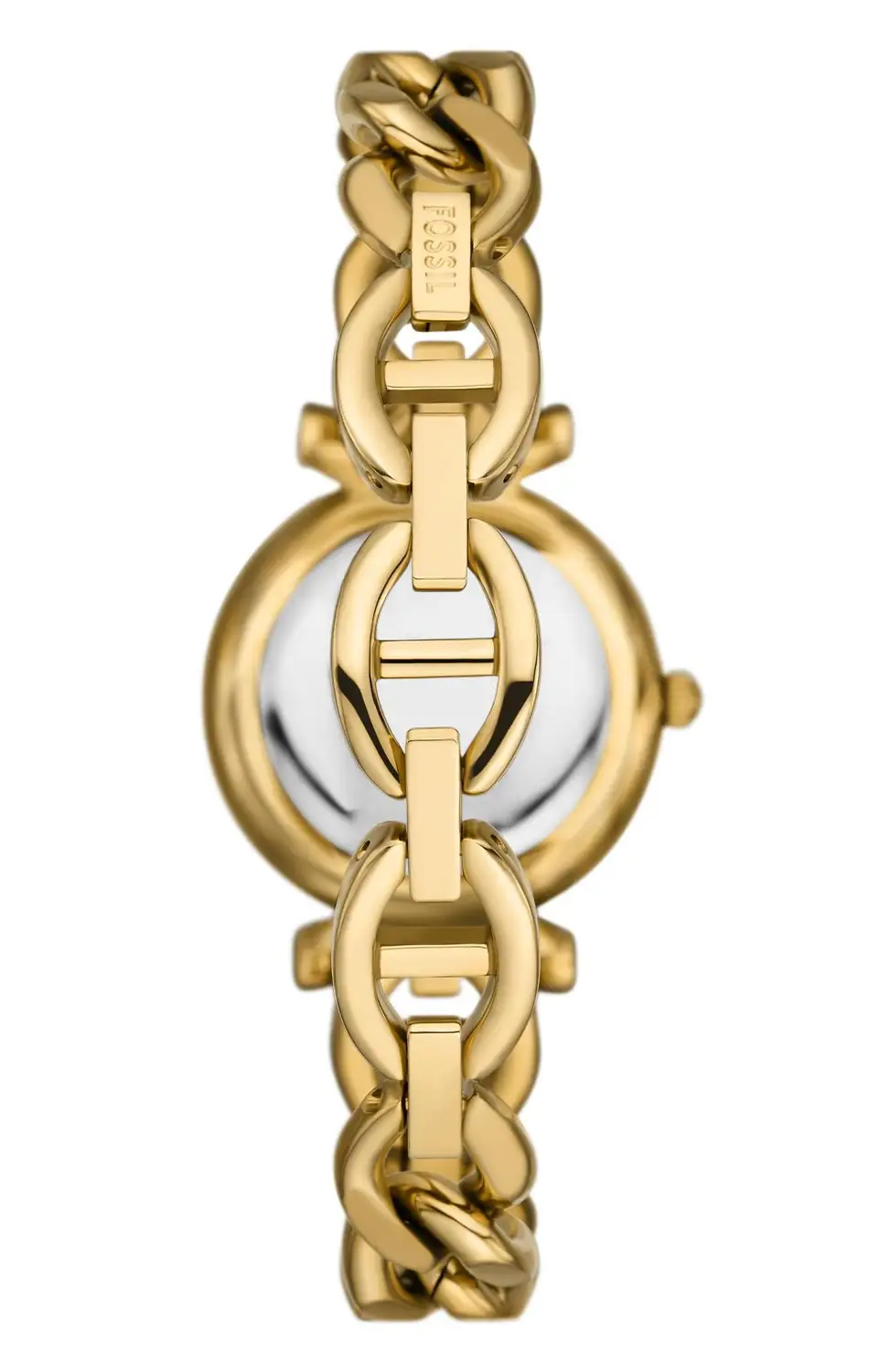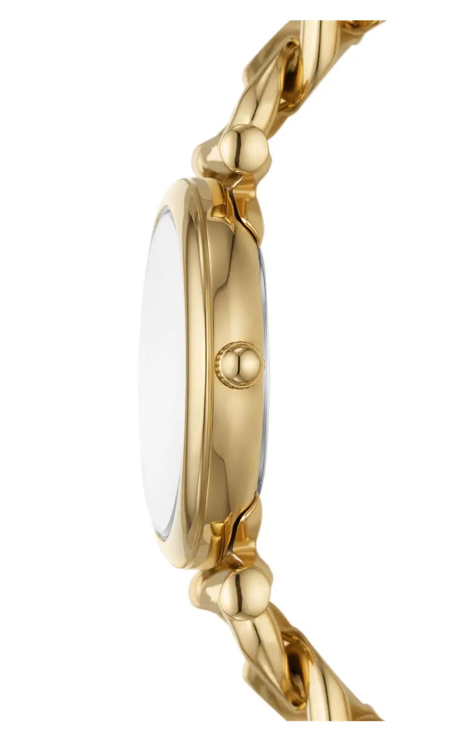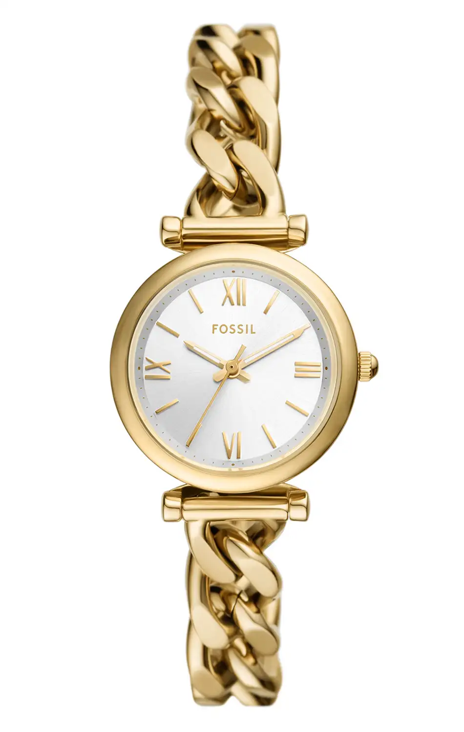 Dámské hodinky Fossil Carlie ES5329 jsou jemnou volbou pro ženy, které vnímají hodinky jako prvek šperku, nikoli pouze jako nástroj k měření času. Štíhlé, pozlacené pouzdro o průměru 28 mm se krásně usazuje na zápěstí, zvýrazňuje jeho linii a dodává stylizaci elegantní, ženský charakter. Světlý ciferník s jemnými římskými indexy si zachovává lehkost a přehlednost a vytváří soudržný, velmi estetický celek.